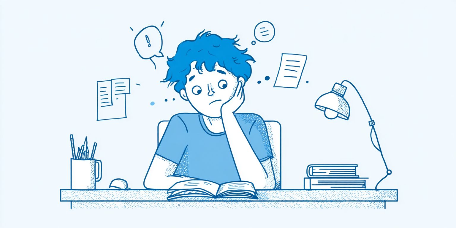 Une illustration minimaliste d'un étudiant mettant en œuvre des techniques de gestion de l'anxiété pendant un test, montrant le dialogue intérieur, la respiration et des stratégies de concentration. Style artistique simple en ligne bleue. Petite composition adaptée au format carte. Pas de texte.