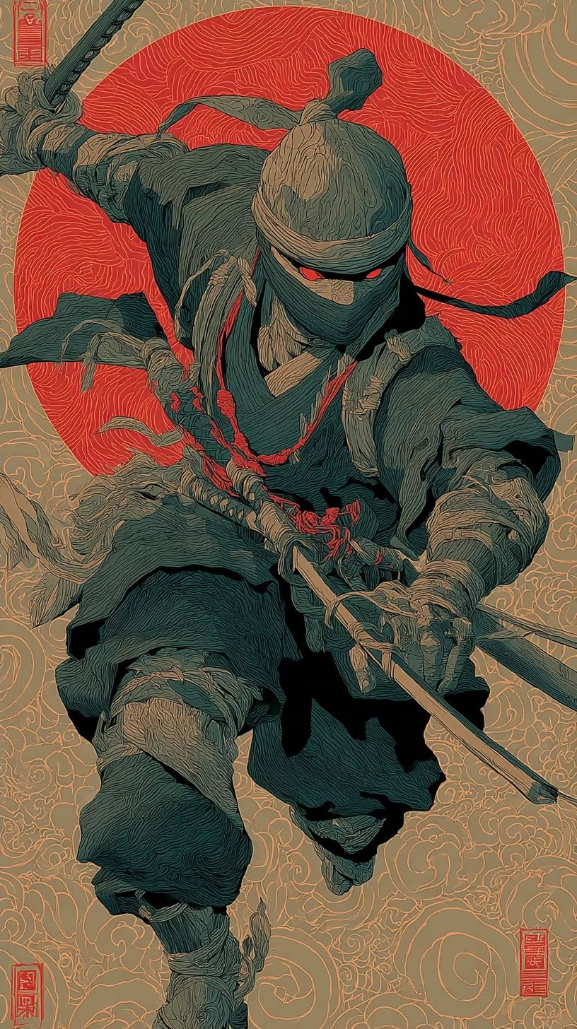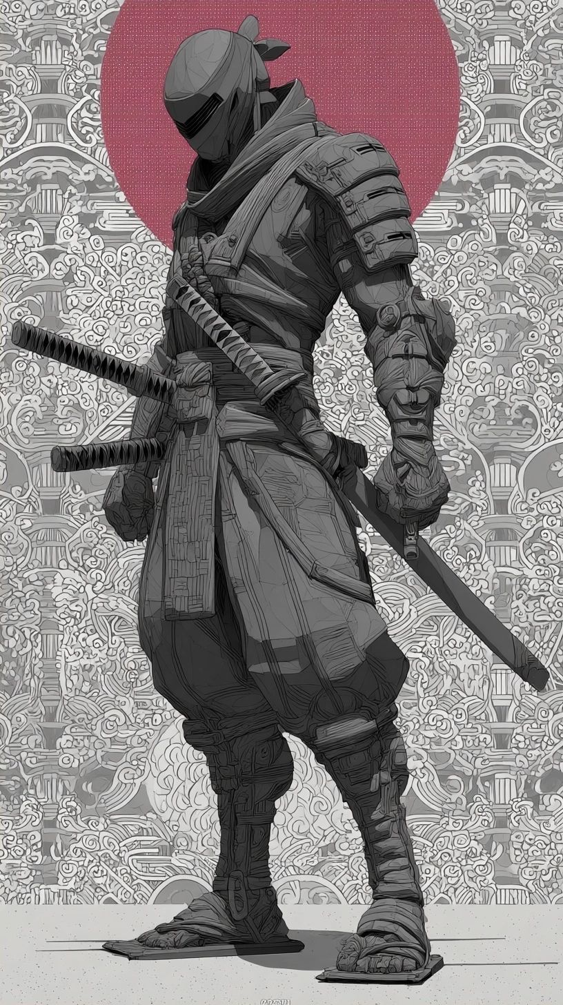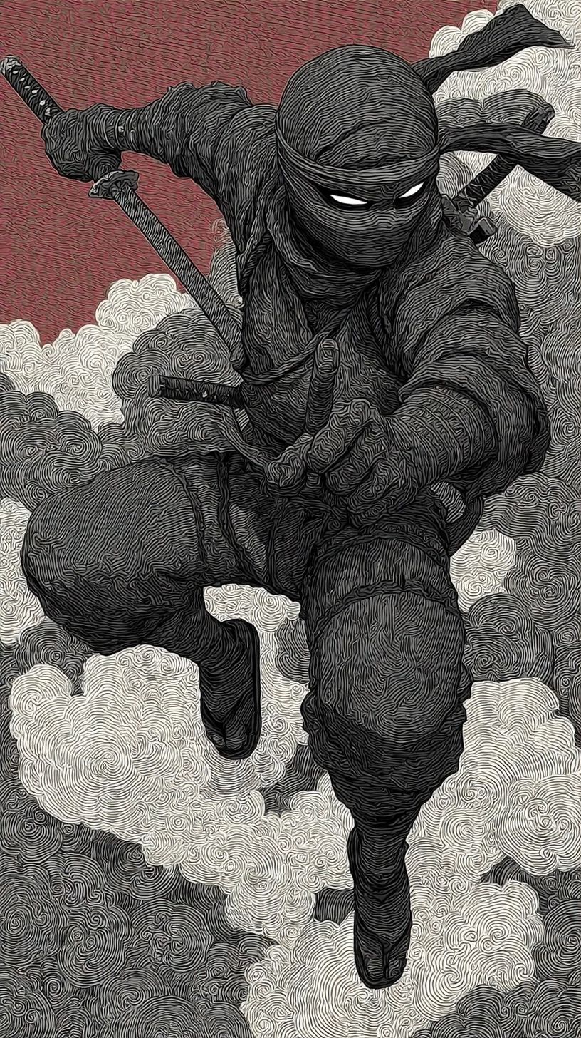 Ninja, full-body illustration with a black color scheme, set against a Japanese-inspired pattern background, in a flat, stylized manner reminiscent of Japanese anime and graffiti art. The design is full of energy, with bold lines and a flat, minimalist aesthetic using dark white and light gray colors, evoking the style of traditional Japanese painting. The image is of high resolution and high quality, with meticulous attention to detail. --ar 9:16 --stylize 400 --v 7.0