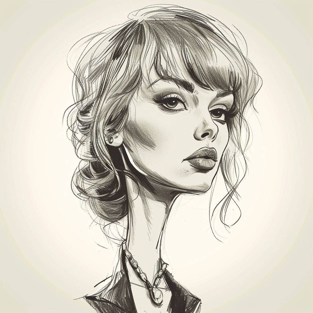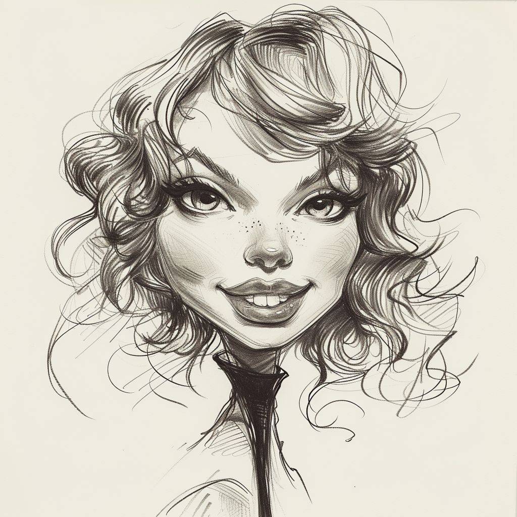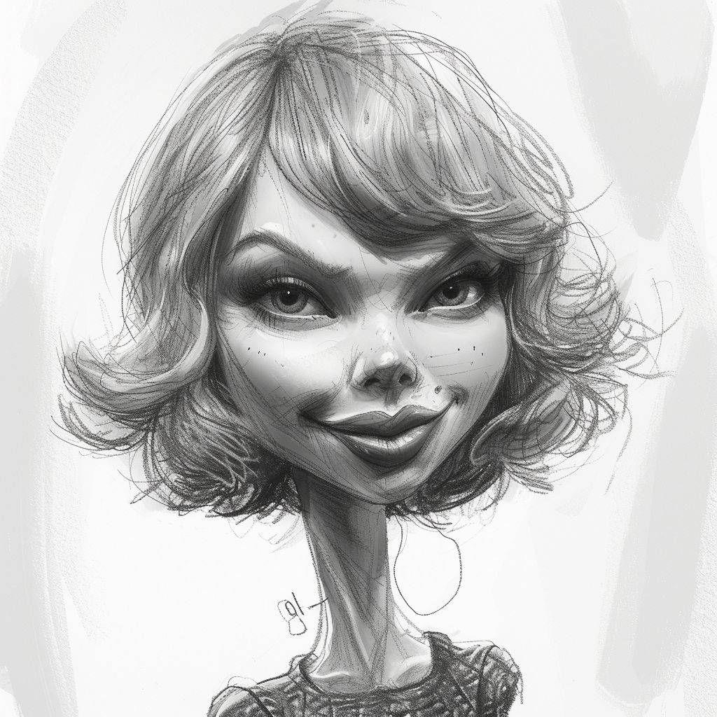 Une caricature au trait brut en noir et blanc de Taylor Swift.