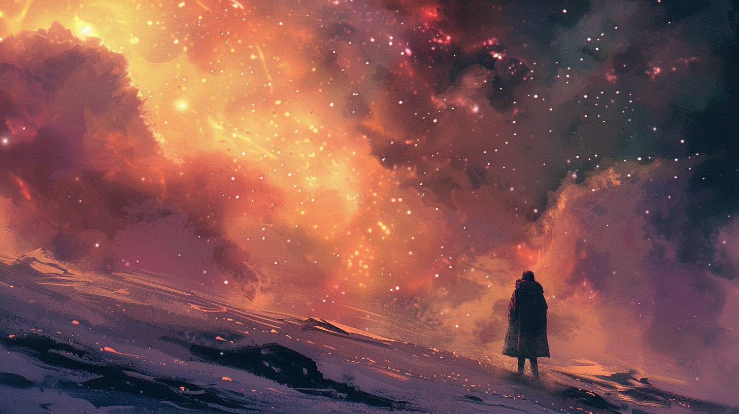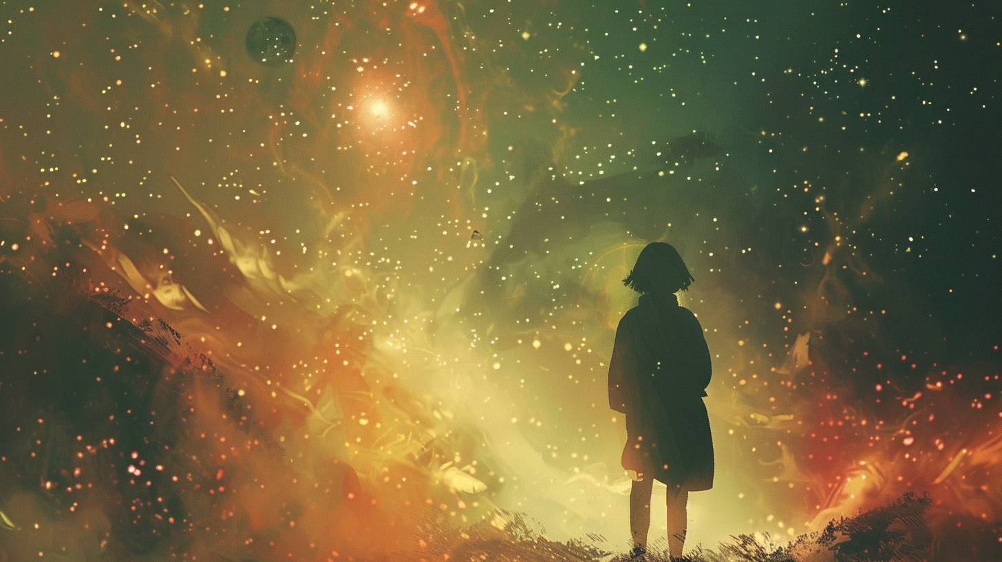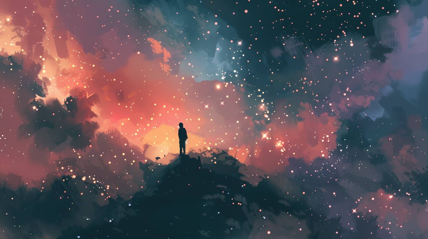 Une illustration d'étoiles et de galaxies dans un style simple, mettant en avant un souvenir flou, utilisant des couleurs atténuées et du minimalisme.