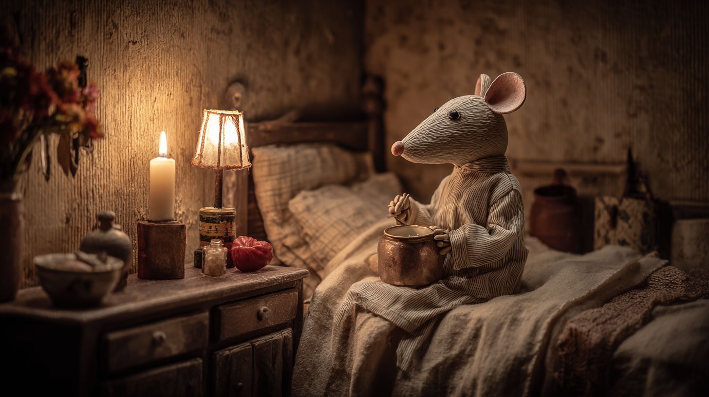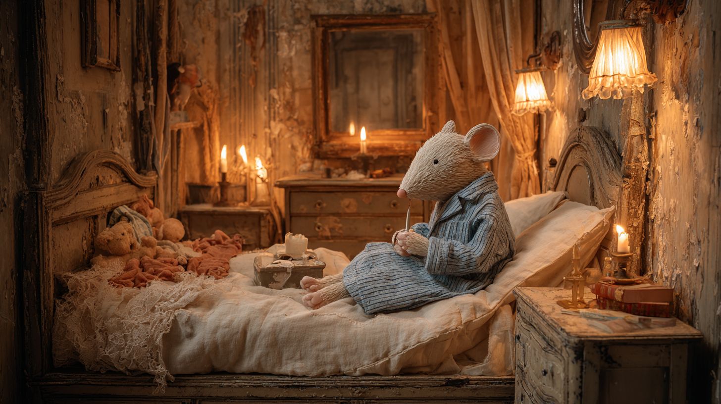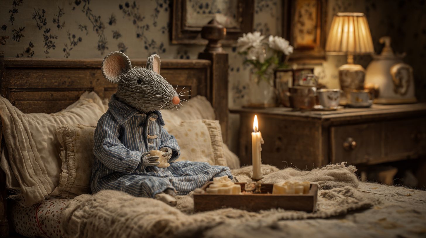 Une souris de Wallace et Gromit en tant que figure de stopmotion avec une bougie et une robe de chambre dans une chambre