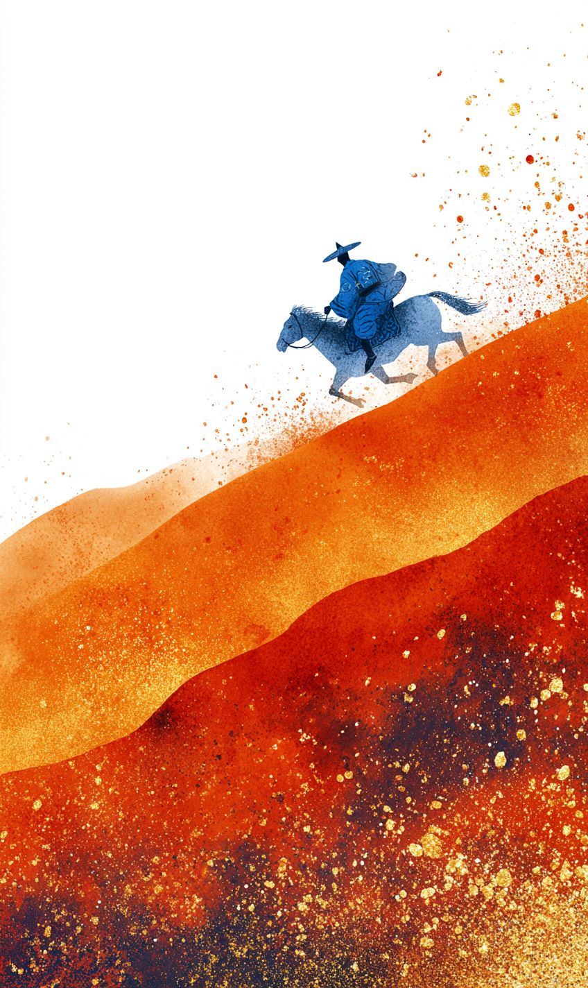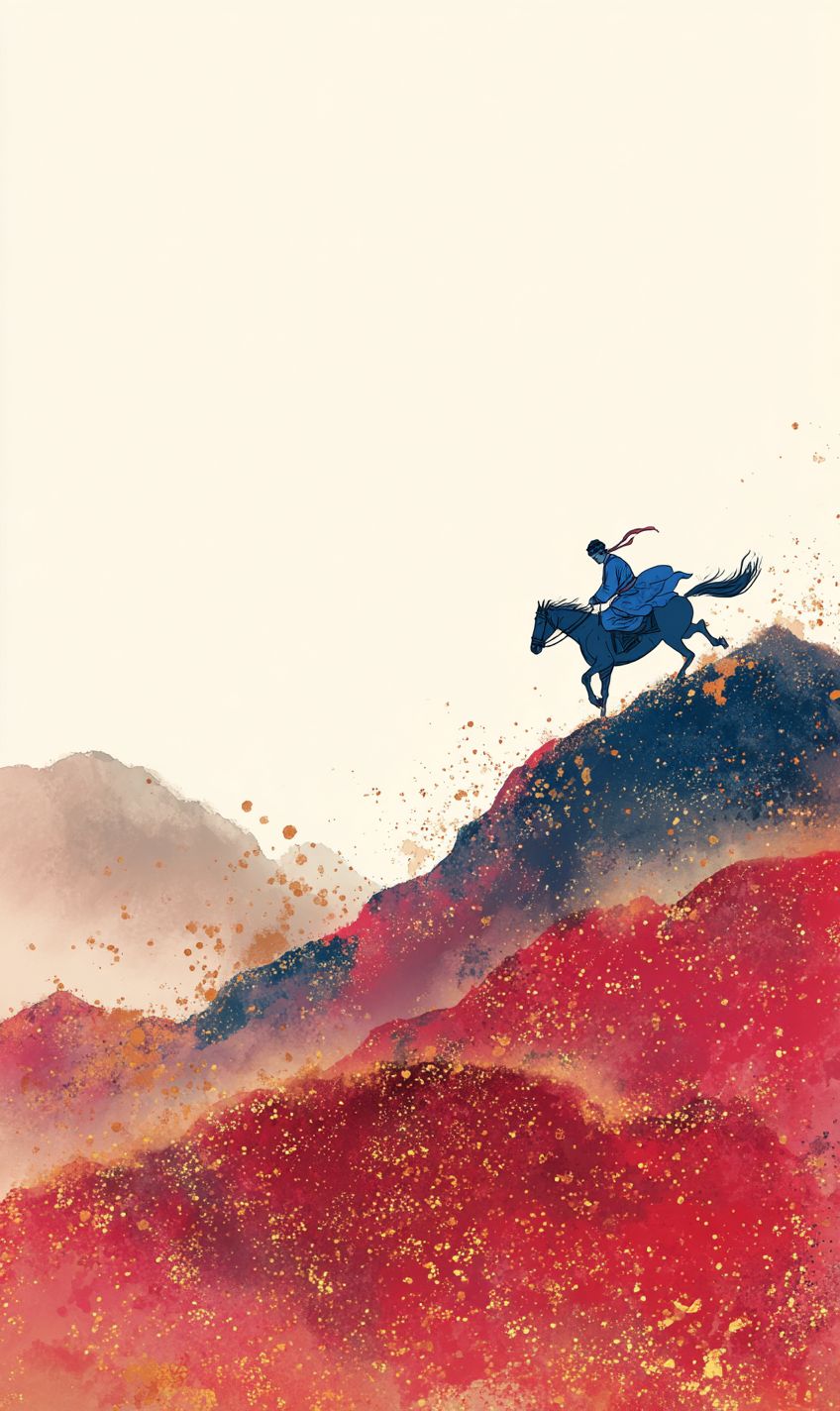 Illustration, nouveau style gongbi, avec un terrain rouge surélevé au bas de l'image, sa surface affichant la texture de la peau de litchi. Un homme de la dynastie Tang en bleu galope dessus. De la poudre d'or éclabousse autour. L'arrière-plan est pur blanc. La composition a une teinte chaleureuse, un sentiment épique, un effet de profondeur de champ, un style de peinture doux, des détails riches, une atmosphère mystérieuse et une qualité rêveuse et brumeuse.