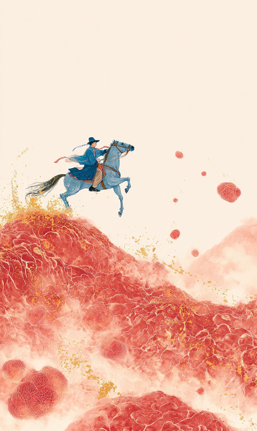 Illustration, new gongbi style, with a red raised terrain at the bottom of the image, its surface displaying the texture of lychee skin. A Tang dynasty man in blue is galloping on top of it. Gold powder splashes around. The background is pure white. The composition has a warm color tone, an epic feel, depth of field effect, a soft painting style, rich details, a mysterious atmosphere, and a dreamy, hazy quality. --ar 3:5 --v 7.0
