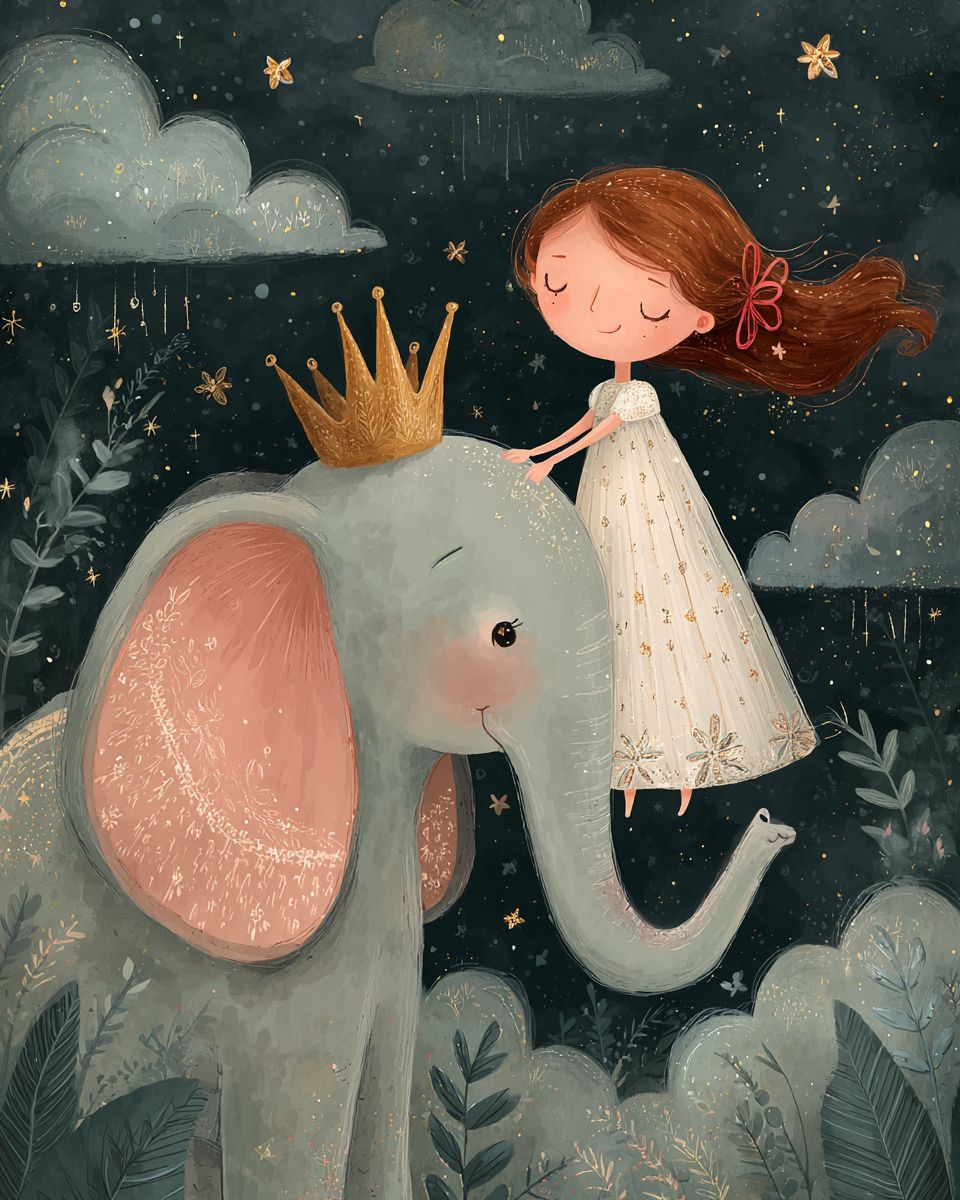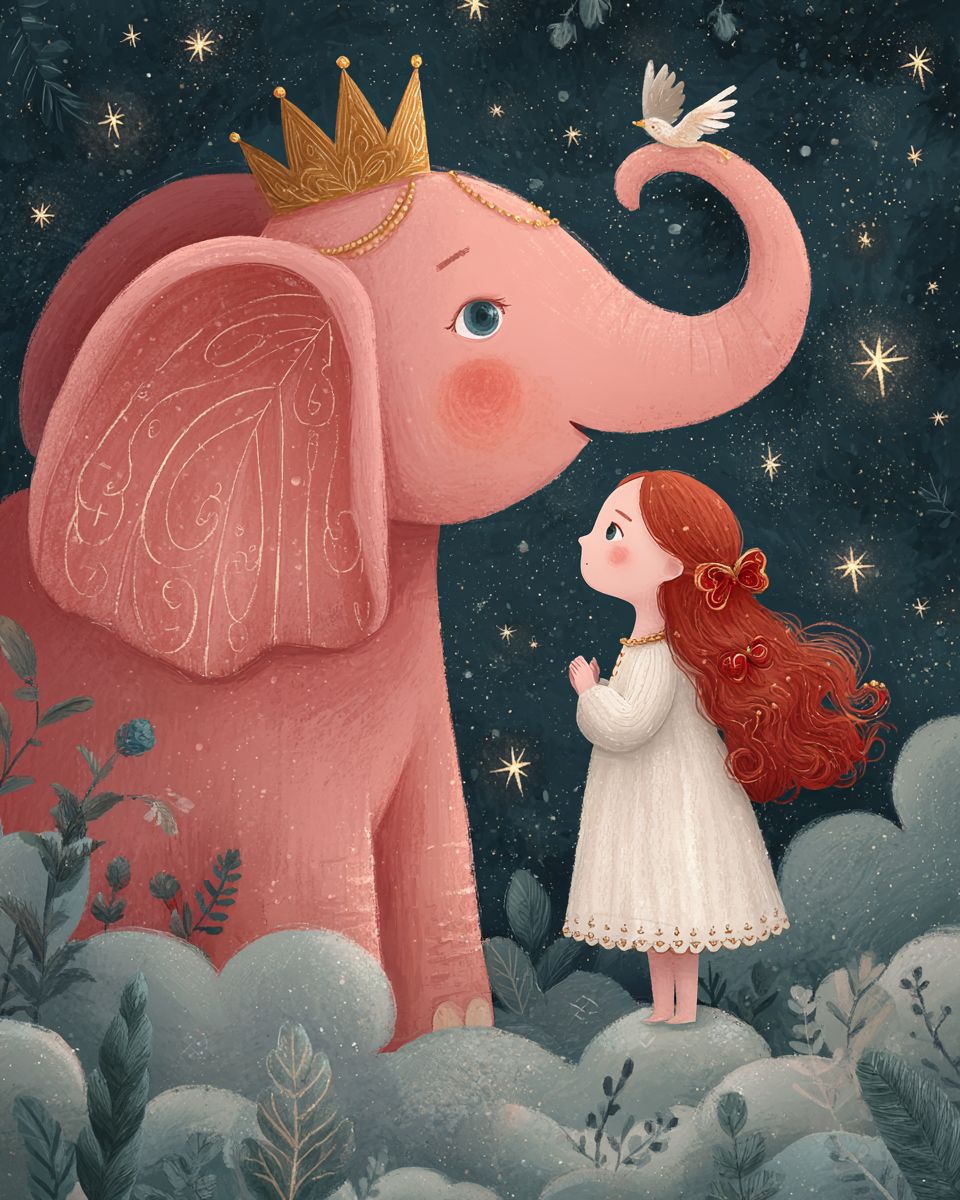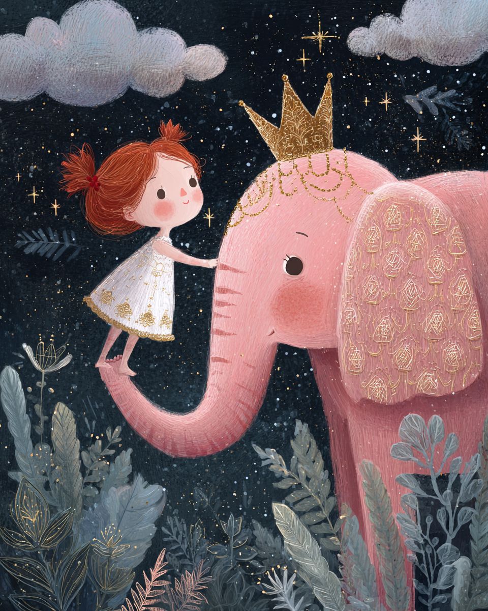 A pink elephant with a golden crown is flying in the sky, holding up an Asian girl wearing a white dress and red hair accessories on its trunk. The background features stars and clouds, creating a dreamy atmosphere. This illustration has soft colors and delicate lines, giving it a cute cartoon style. It was created in the style of Li Shuxing using digital painting techniques. --ar 4:5 --profile js84qnz --stylize 250