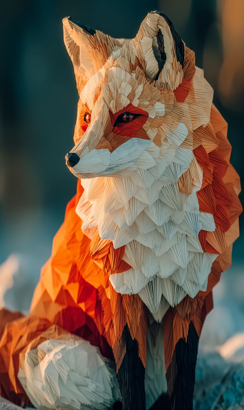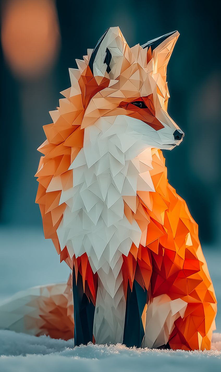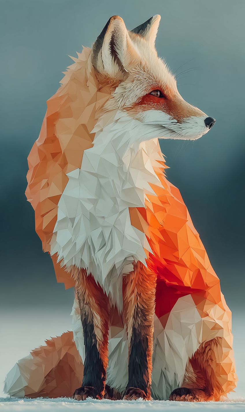 A low-poly 3D render of a fox, constructed from clean triangular facets and shaded in flat orange and white tones. Set in a stylized minimalist environment with crisp geometry and soft ambient occlusion, the scene evokes a playful, digital diorama with sharp edges and visual simplicity. --ar 3:5 --v 7.0 --s 750