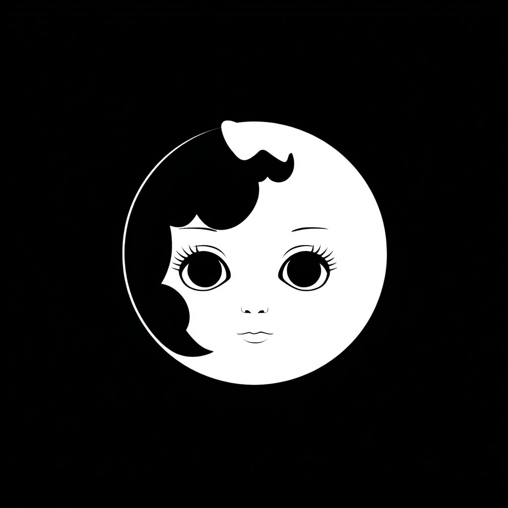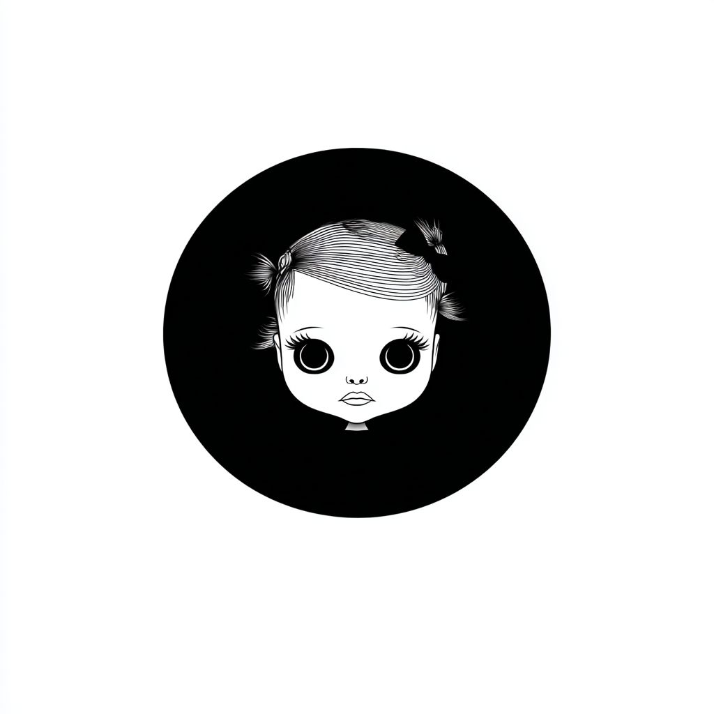 Générez un logo minimaliste, avec des tons noir et blanc, représentant le visage d'une poupée Blythe ou BJD, avec un fond totalement blanc, logo vectorisé.