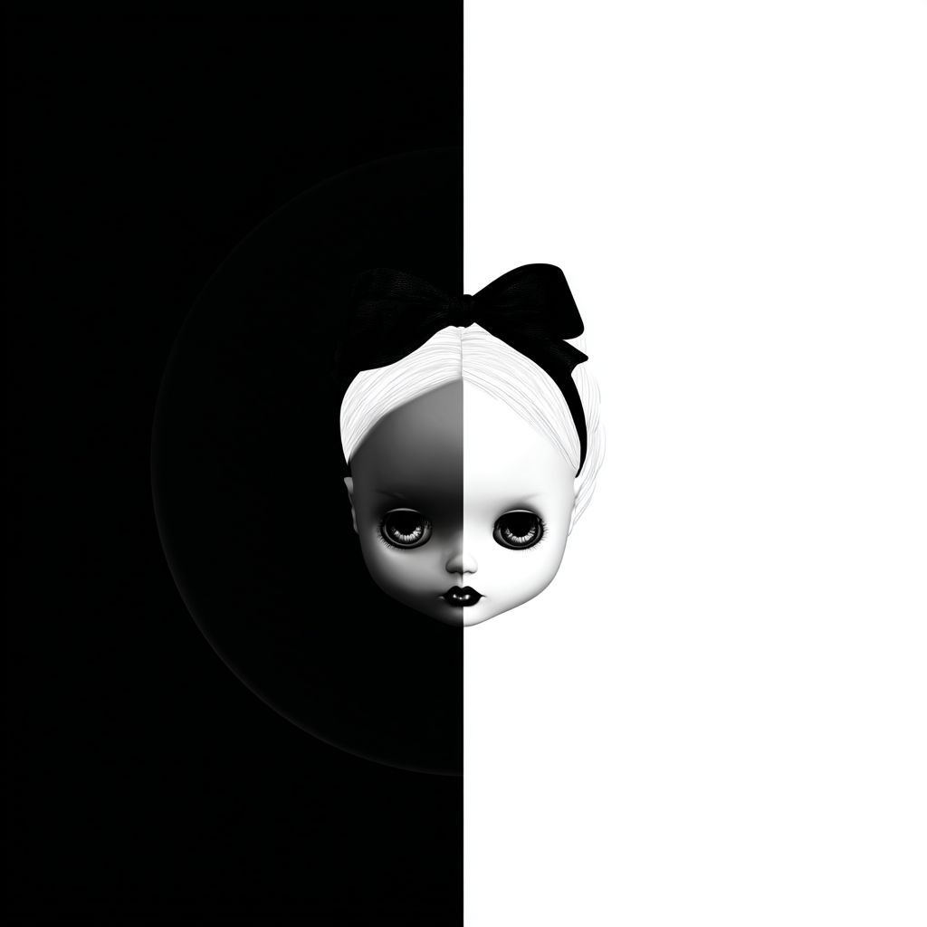 Gere uma logo minimalista, com tons de preto e branco, com rosto de boneca blythe ou BJD, com fundo branco totalmente branco, logo vetorizada --stylize 0