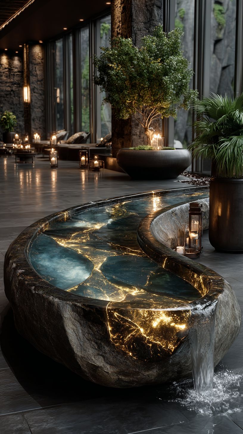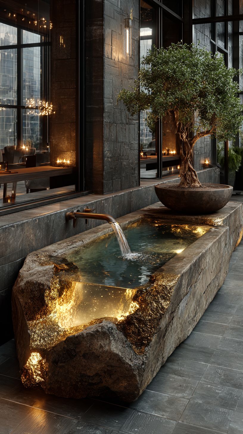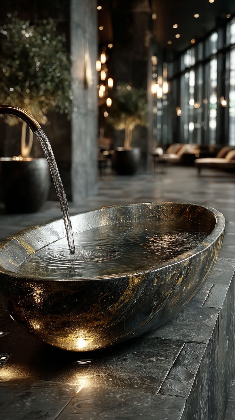 an upclose, small obsidian and gold geode floating bathroom sink, semi-transparent quartz, illuminated from within, water running from pipe, high-end bathroom, slate tiles, spa setting, indoor waterfall, marble flooring, large windows, olive plant in a large pot, luxurious, spacias, 8k, focus, crisp, hyper-realistic, slow camera movement, cinematic, active scene --ar 9:16 --s 750