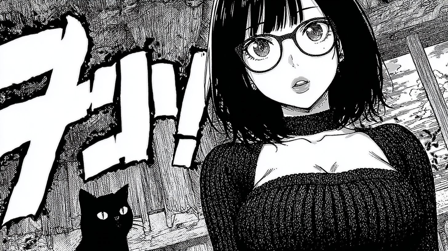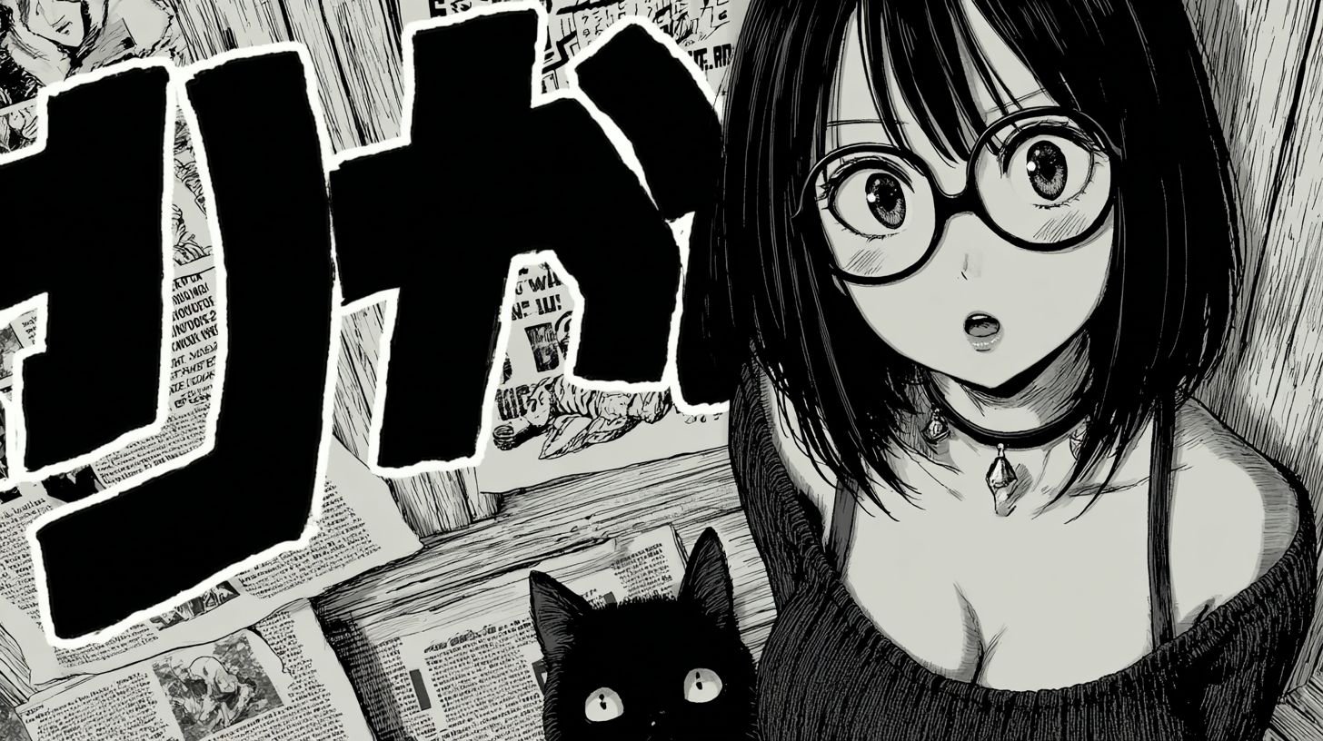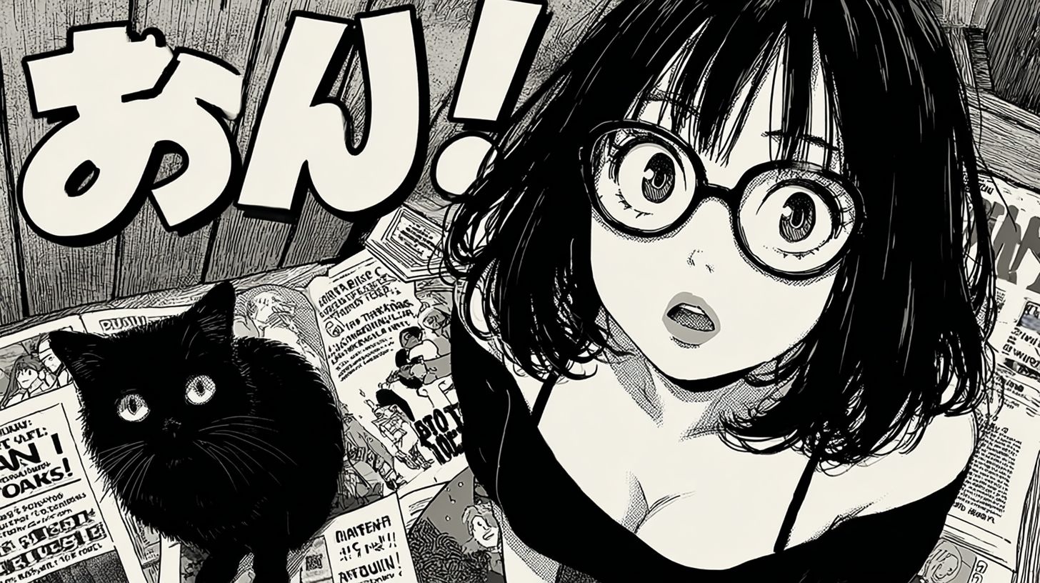 anime-style cinematic final scene, large Japanese text "おしまい" displayed prominently in the center, black-haired bob-cut girl with glasses standing or sitting beside a small black cat, both facing the viewer or looking peaceful, soft lighting, calm background (indoor or outdoor), warm color tones, cel shading, emotional tone, anime aesthetic --ar 16:9 --sref 4153834267 --s 750