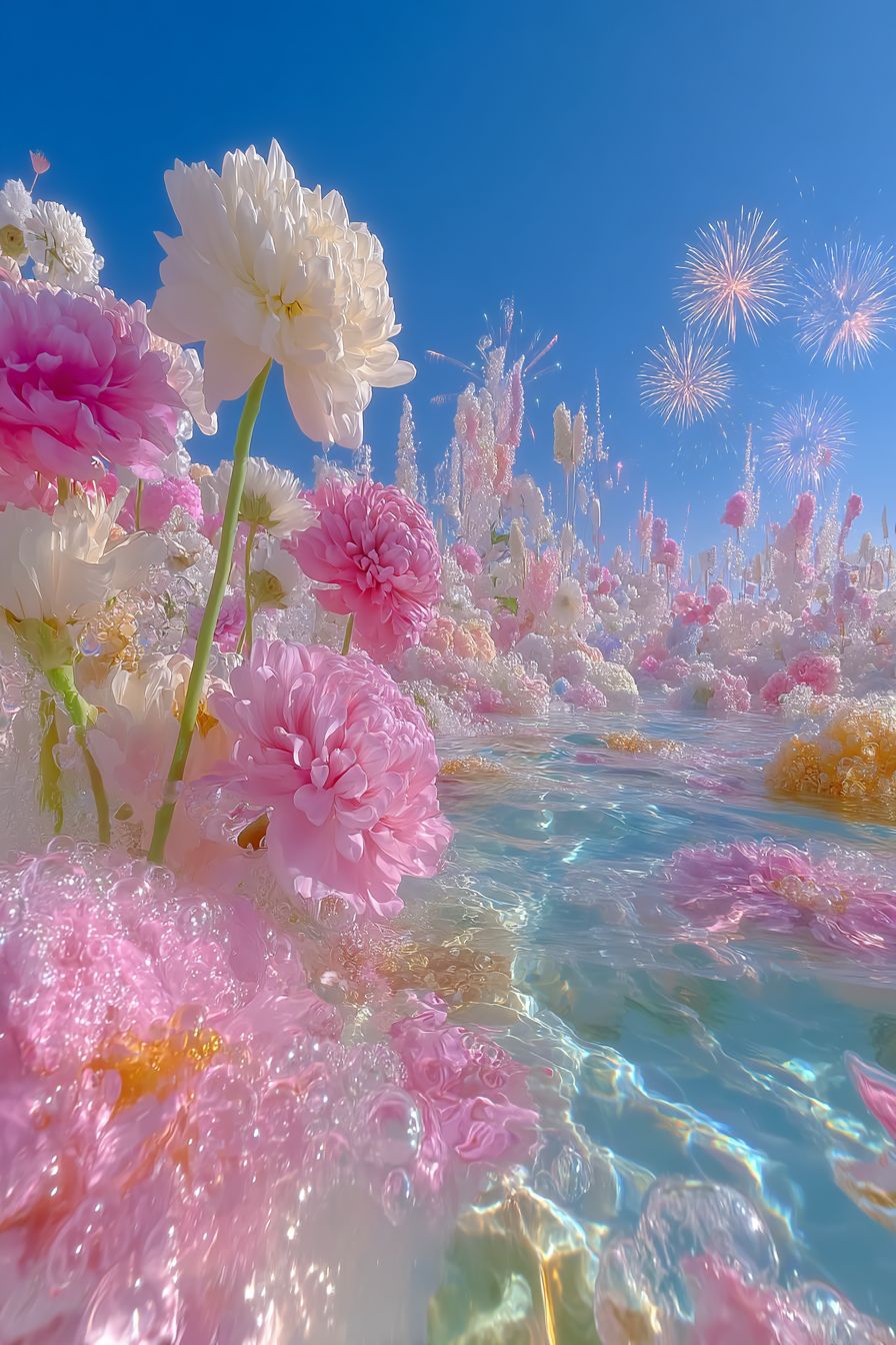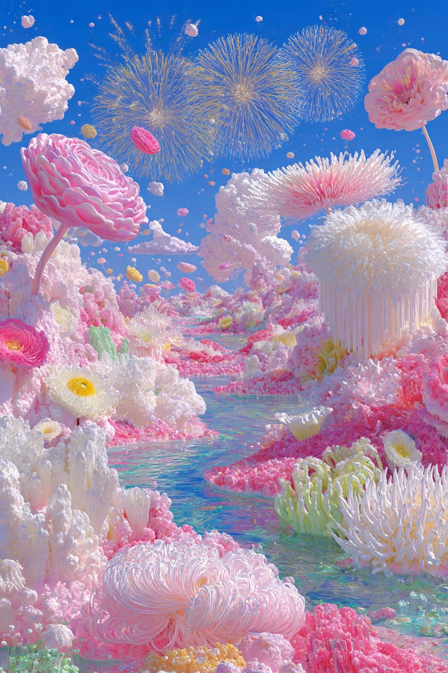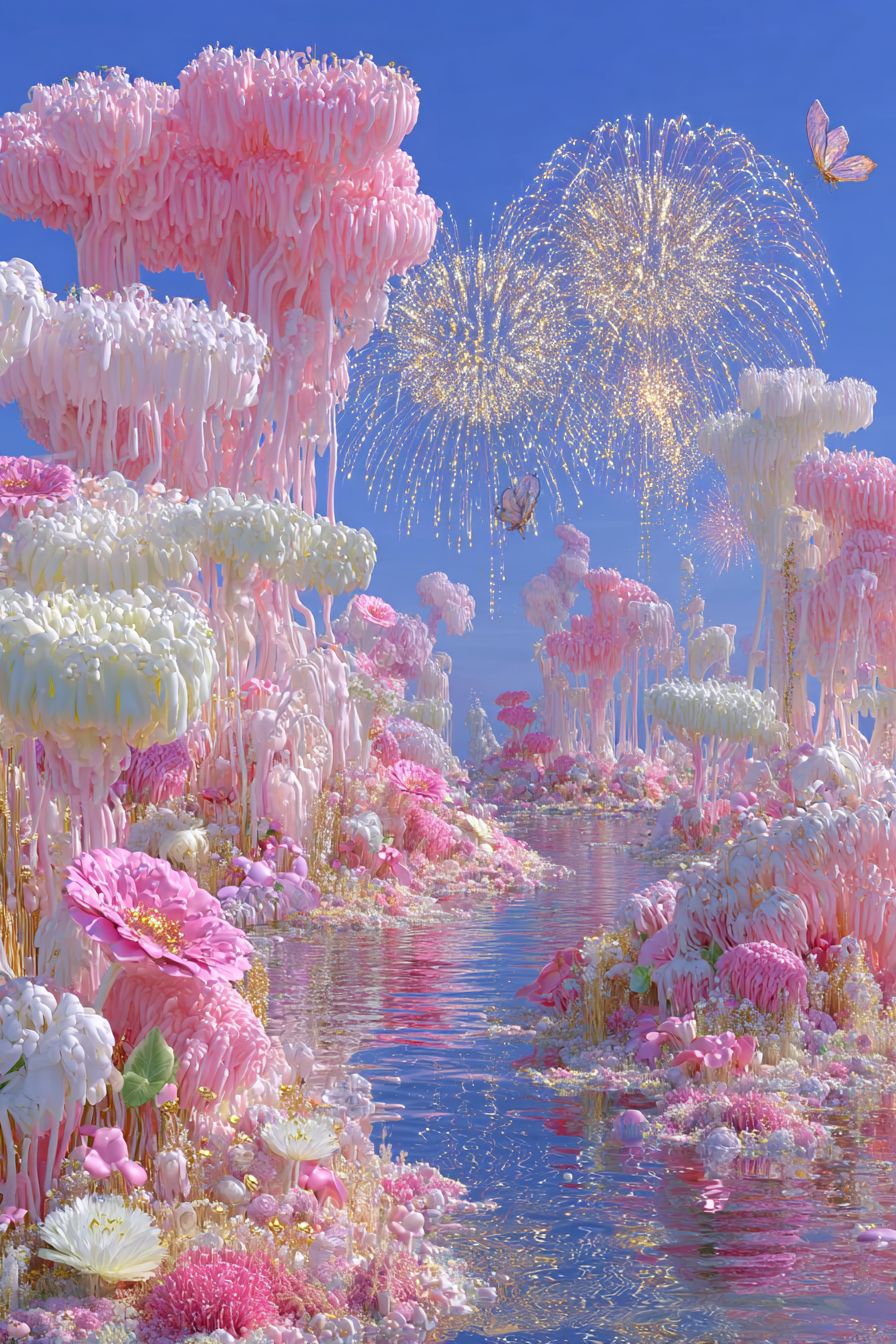 The fusion of pool core and dream core aesthetics, surreal realism, full of dream colors; Composition: flat layout, emphasizing the blurred sense of space; Theme: The sea at night, golden and white fireworks soaked in the water, fireworks on the seabed, pink and golden green flowers (some even flying in the air), the scene is strange; Lighting: The moonlight is illuminated into the water through the light and shadow, creating a tranquil atmosphere; Clean color matching, quiet atmosphere, --ar 2:3 --raw --profile k8vehnp --s 750