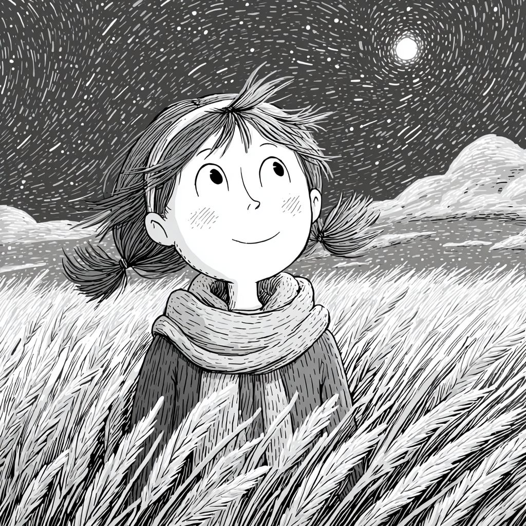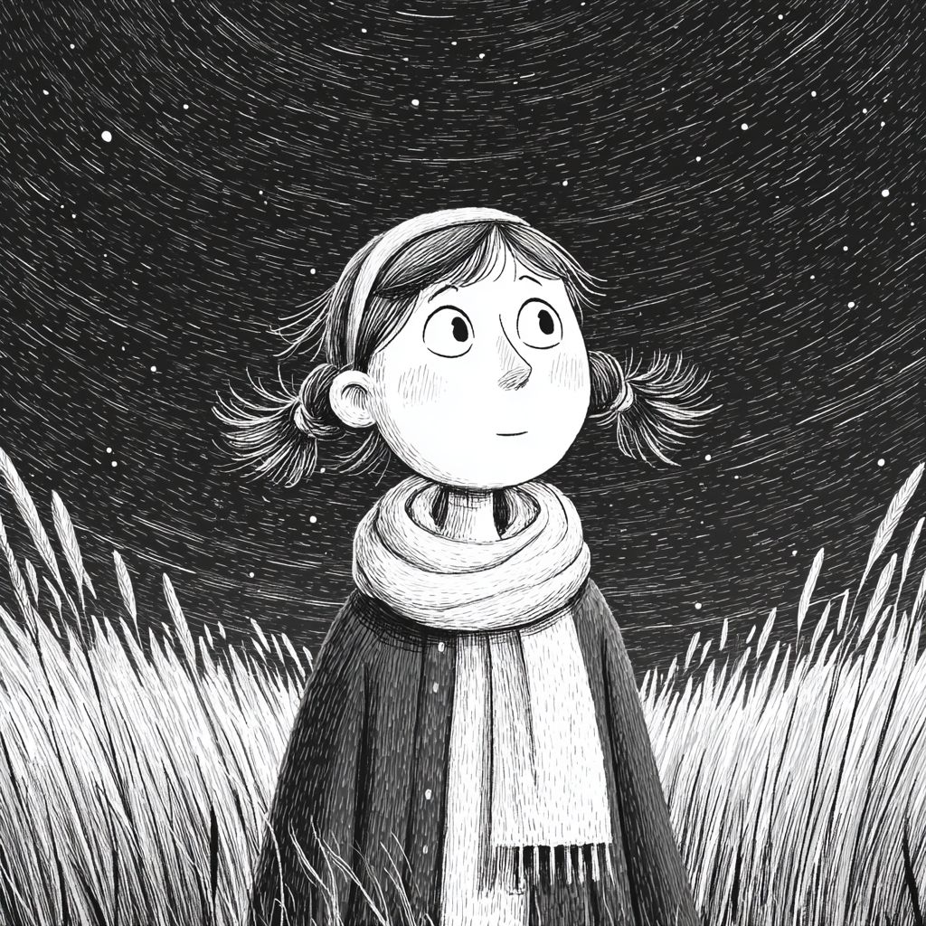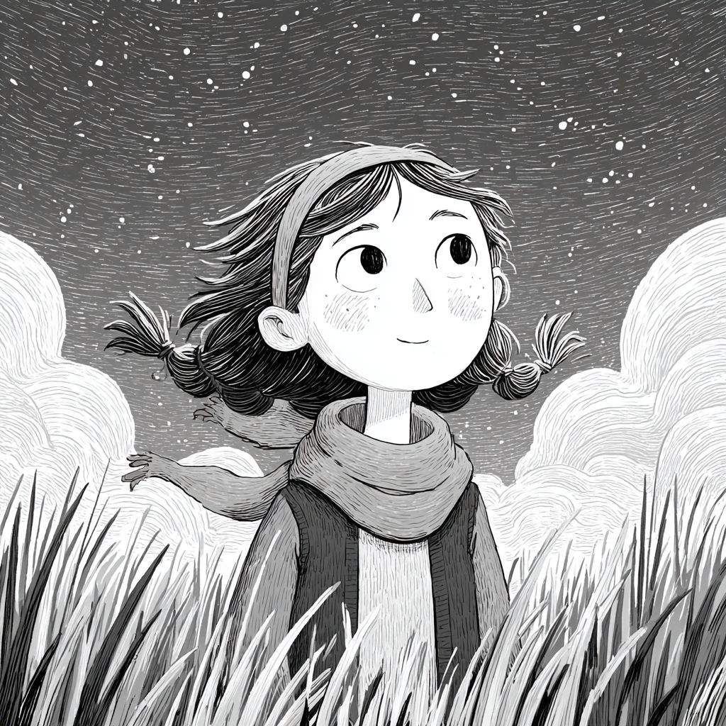 Une jeune fille avec deux queues de cheval courtes et un bandeau, partiellement cachée dans des herbes hautes dans un champ ouvert et tranquille la nuit, faisant face avec une expression douce et heureuse, la tête inclinée vers le haut pour admirer les étoiles et la pleine lune, visage simple et arrondi, grands yeux ovales, petit nez et bouche, traits scandinaves doux, le vent souffle doucement sa robe et son écharpe, des nuages enroulés stylisés et des constellations au-dessus, style d'impression en linogravure, lignes sculptées audacieuses, noir et blanc, sans couleur, fort contraste, esthétique vintage faite main, dans le style des personnages humains des Moomins, livres de Moomin par Tove Jansson, illustration de contes de fées scandinaves des années 1950, style de dessin à l'encre.