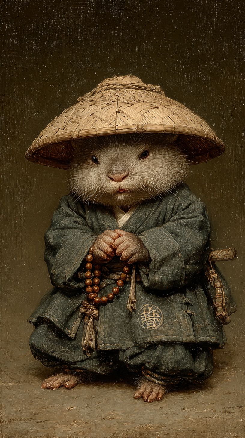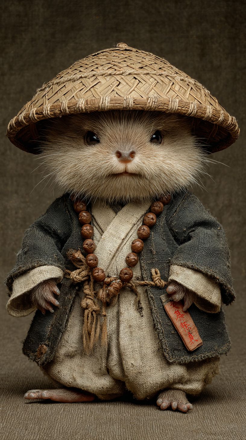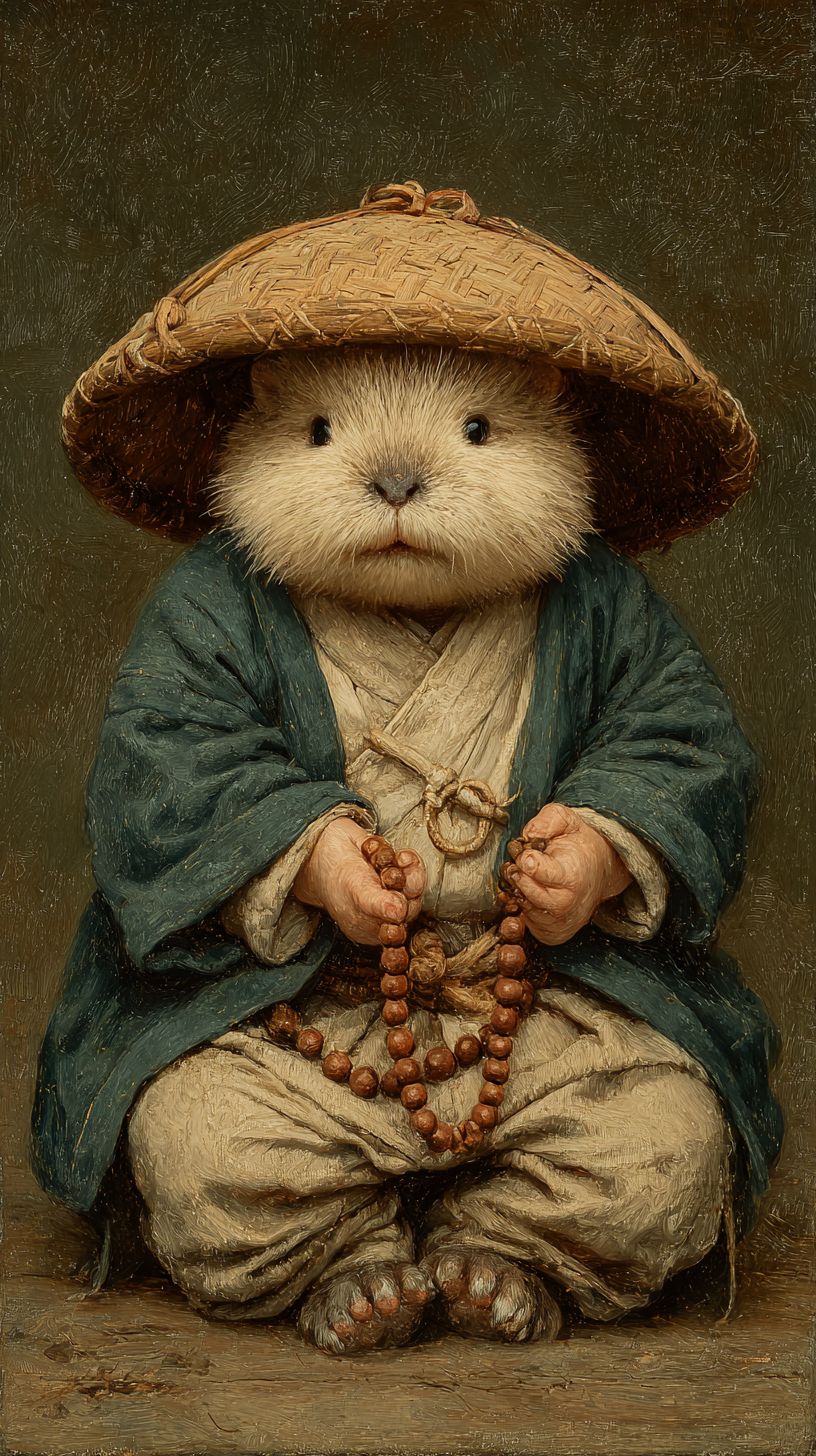 Petit castor en vêtements de moine, assis en tailleur avec un chapeau en bambou et des perles bouddhistes