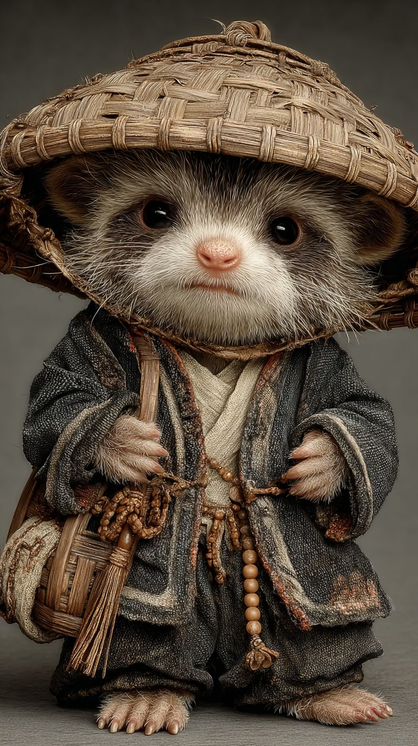 Fine brushwork, little meerkat, front view, wearing a bamboo hat, full body close-up, sitting cross-legged, wearing monk's clothes, wearing a string of Buddhist beads, with hands folded, cute, ancient Chinese style, --ar 9:16 --s 750