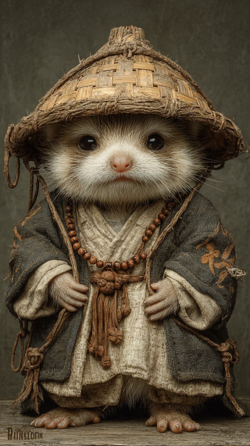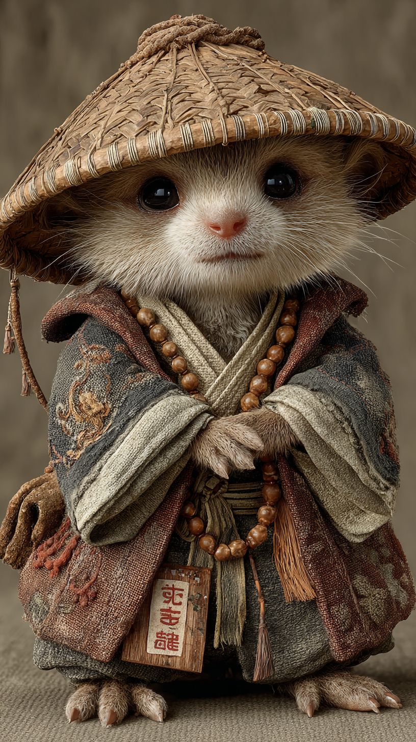 Finesse de pinceau, petit suricate, vue de face, portant un chapeau en bambou, gros plan sur tout le corps, assis en tailleur, portant des vêtements de moine, avec un collier de perles bouddhistes, les mains jointes, mignon, style chinois ancien.