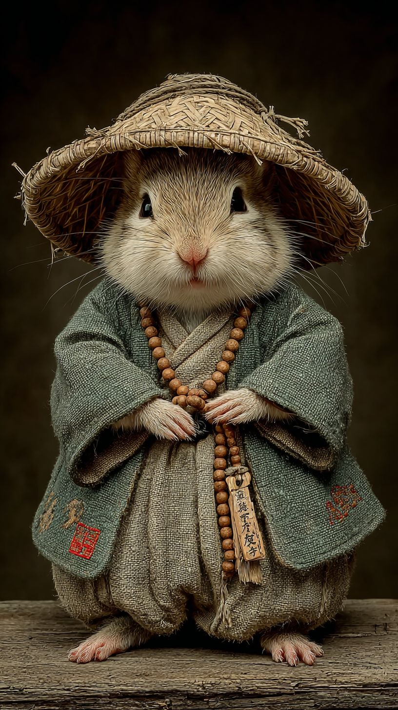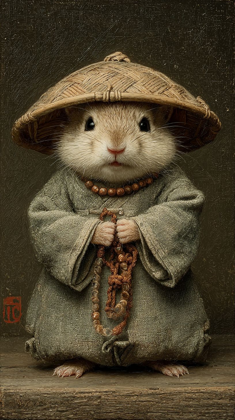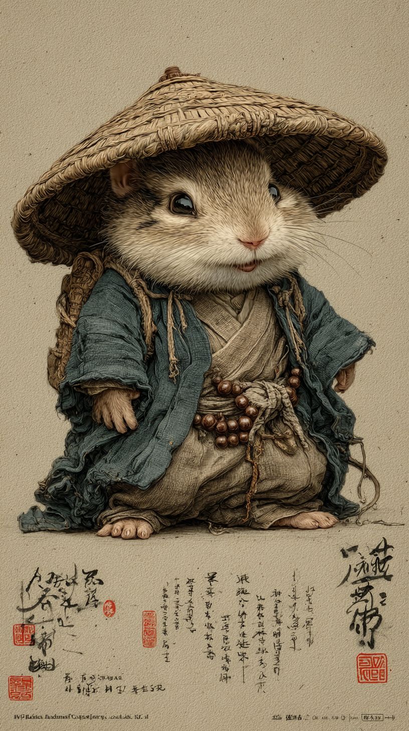 Fine brushwork, little chipmunk, front view, wearing a bamboo hat, full body close-up, sitting cross-legged, wearing monk's clothes, wearing a string of Buddhist beads, with hands folded, cute, ancient Chinese style, --ar 9:16 --s 750