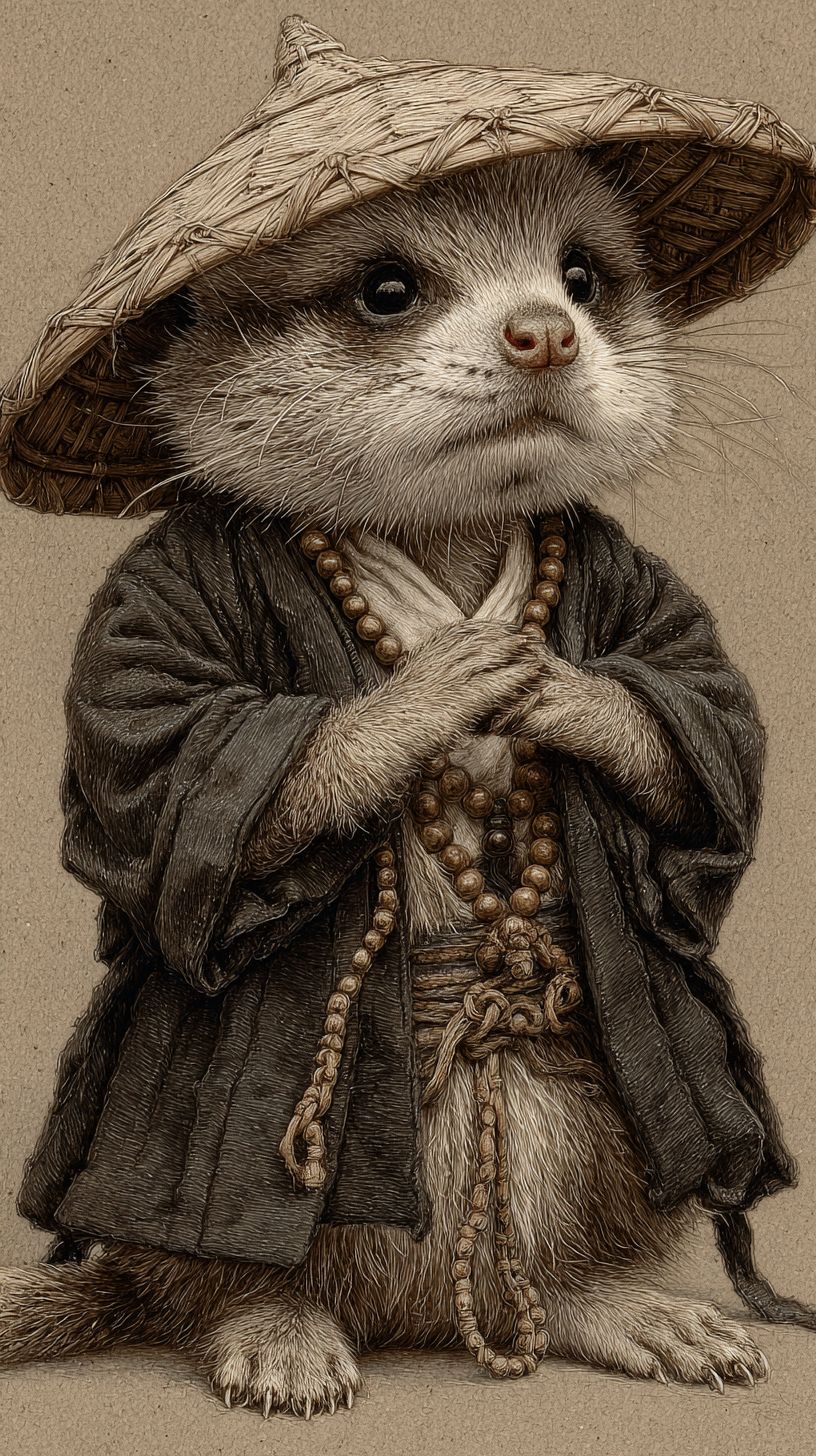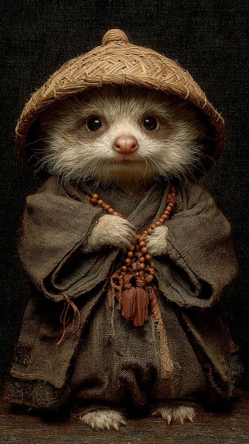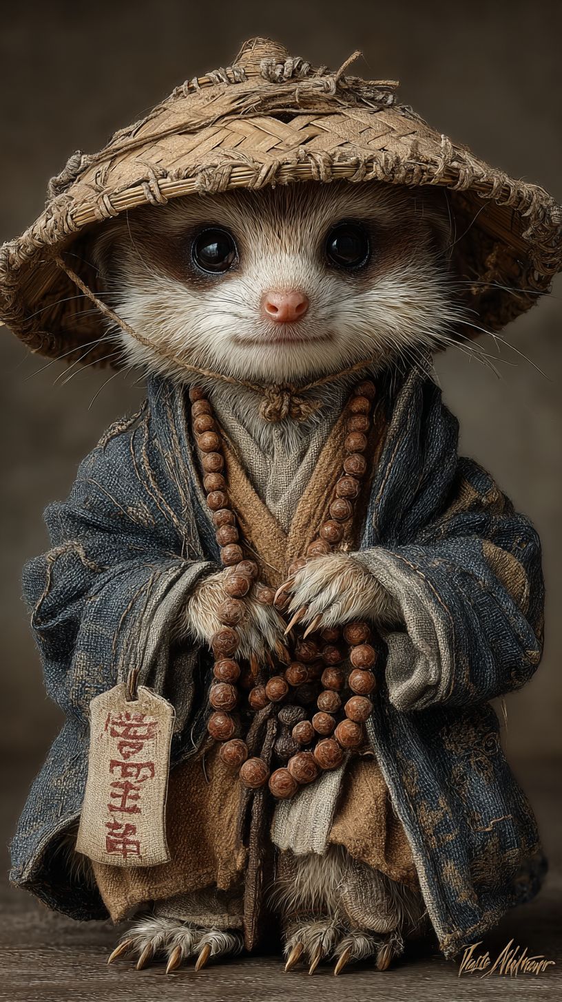 Fine brushwork, little meerkat, front view, wearing a bamboo hat, full body close-up, sitting cross-legged, wearing monk's clothes, wearing a string of Buddhist beads, with hands folded, cute, ancient Chinese style, --ar 9:16 --s 750