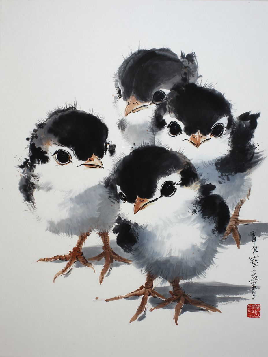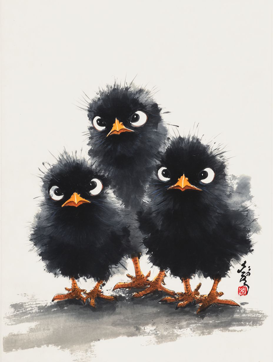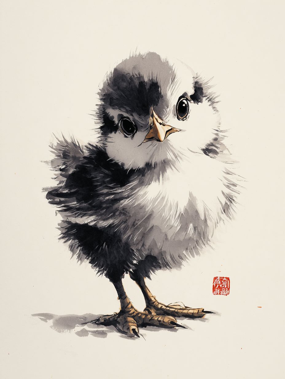 Une peinture à l'encre chinoise fantaisiste d'un groupe de poussins joueurs et adorables, évoquant magistralement l'esprit du travail de pinceau de Qi Baishi, mais infusée d'une touche délicieuse et exagérée. Les poussins possèdent une expression comiquement sérieuse mais douce, de grands yeux pleins d'une curiosité innocente, et une posture charmante, légèrement maladroite. Rendu dans des lavis d'encre de couleurs exagérées dynamiques. La composition utilise des coups de pinceau audacieux, puissants et fluides pour capturer un sens de force monumentale combiné avec une maladresse attachante, ancrée dans l'esthétique chinoise classique, mais rayonnant un esprit moderne et léger. Fond blanc pur, sans inscription ni signature rouge, mettant en valeur la forme solide et l'esprit doux du groupe de poussins.