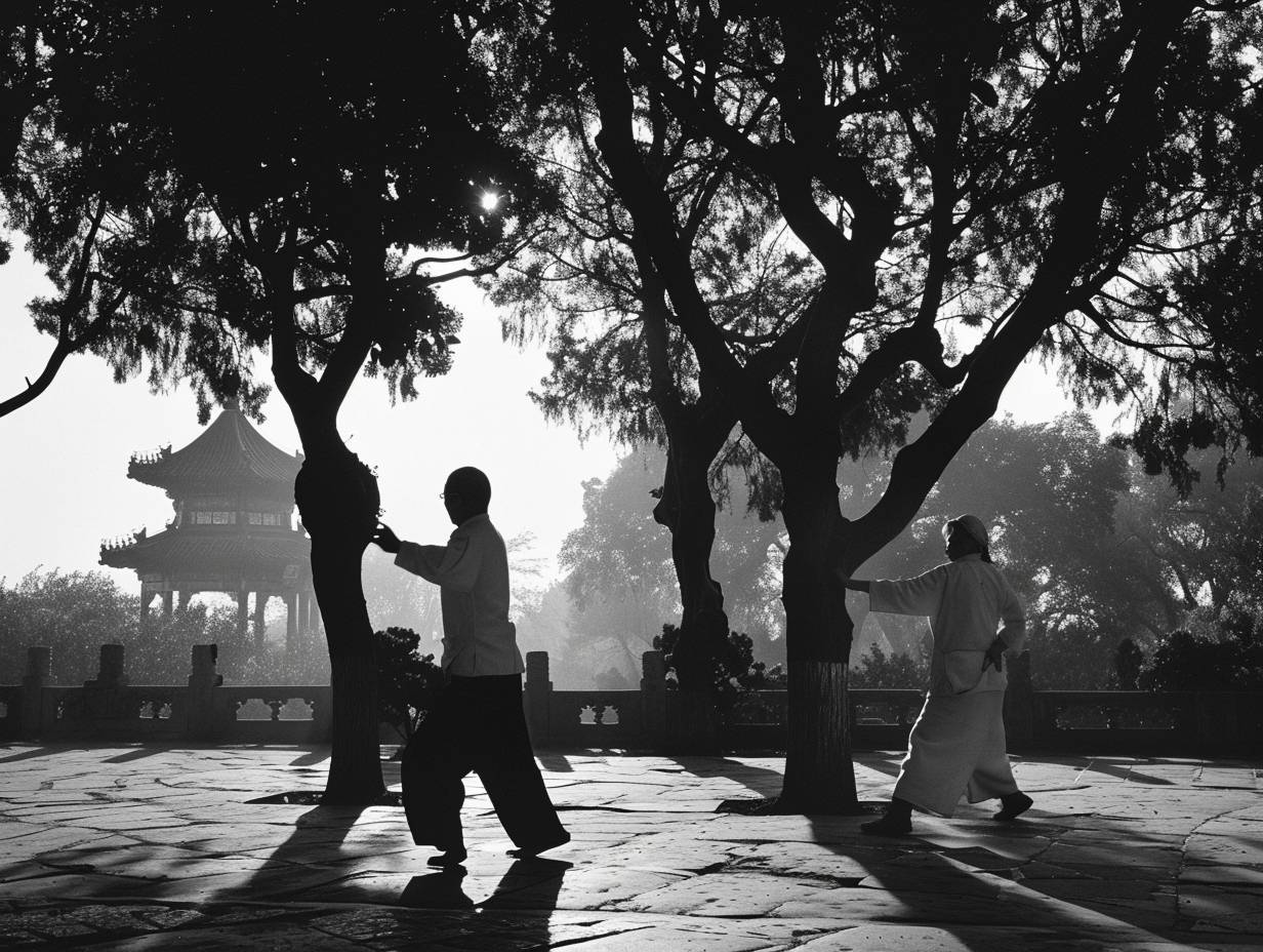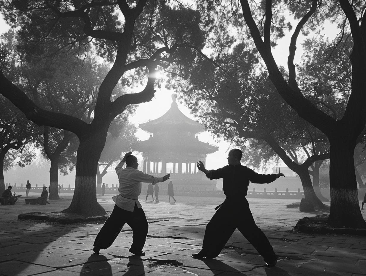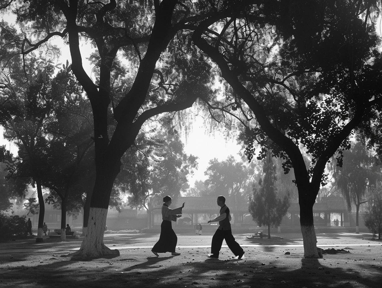 Couple practicing Tai Chi. Serenity and focus. Traditional attire. Beijing's Temple of Heaven Park. Dawn in 2008. Ancient trees, a pagoda, other practitioners. Medium shot, full body. Shot on a Leica M8, Kodak Tri-X 400 film. First light of the day, leaves rustling, high contrast. --ar 4:3 --v 6.0