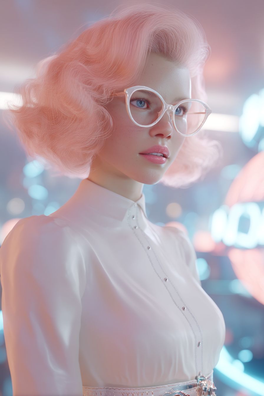 Gros plan cinématique extrême d'une femme rétro atompunk des années 1950 dans une rue futuriste teintée de néon, CGI hyper-réaliste, profondeur de champ extrême. Elle a des cheveux courts et volumineux d'un rose pêche pastel en vagues et boucles douces à la manière des années 50, encadrant son visage de porcelaine pâle comme un nuage flottant. Ses lunettes rondes à verres cat-eye blancs captent la lumière ambiante. Anatomie du visage finement détaillée : nez délicat, pommettes sculptées doucement avec une touche de rose, lèvres naturelles pleines avec un éclat rose transparent, yeux d'un ton rose intense sous des sourcils finement arqués. Elle porte une blouse en satin blanc perlé à col haut avec un col structuré et de petits boutons en perles, des manches longues ajustées se terminant par des poignets étroits. Autour de sa taille mésomorphe fine, une ceinture en chrome brillant avec des motifs atomiques subtils. Pas de courbes exagérées ou d'érotisation. Fond : horizon atompunk légèrement flou — flèches chromées élégantes, enseignes néon rétro-futuristes, légère bruine formant des flaques scintillantes. Éclairage cinématographique dramatique : éclairage de fond bleu froid et éclairage principal pêche chaud mettent en valeur chaque mèche de cheveux, pli de tissu et contour de son visage. Ambiance : rêveuse, élégante, charmante et futuriste avec une touche des années 1950. Pas de texte, pas de logos, anatomie impeccable.