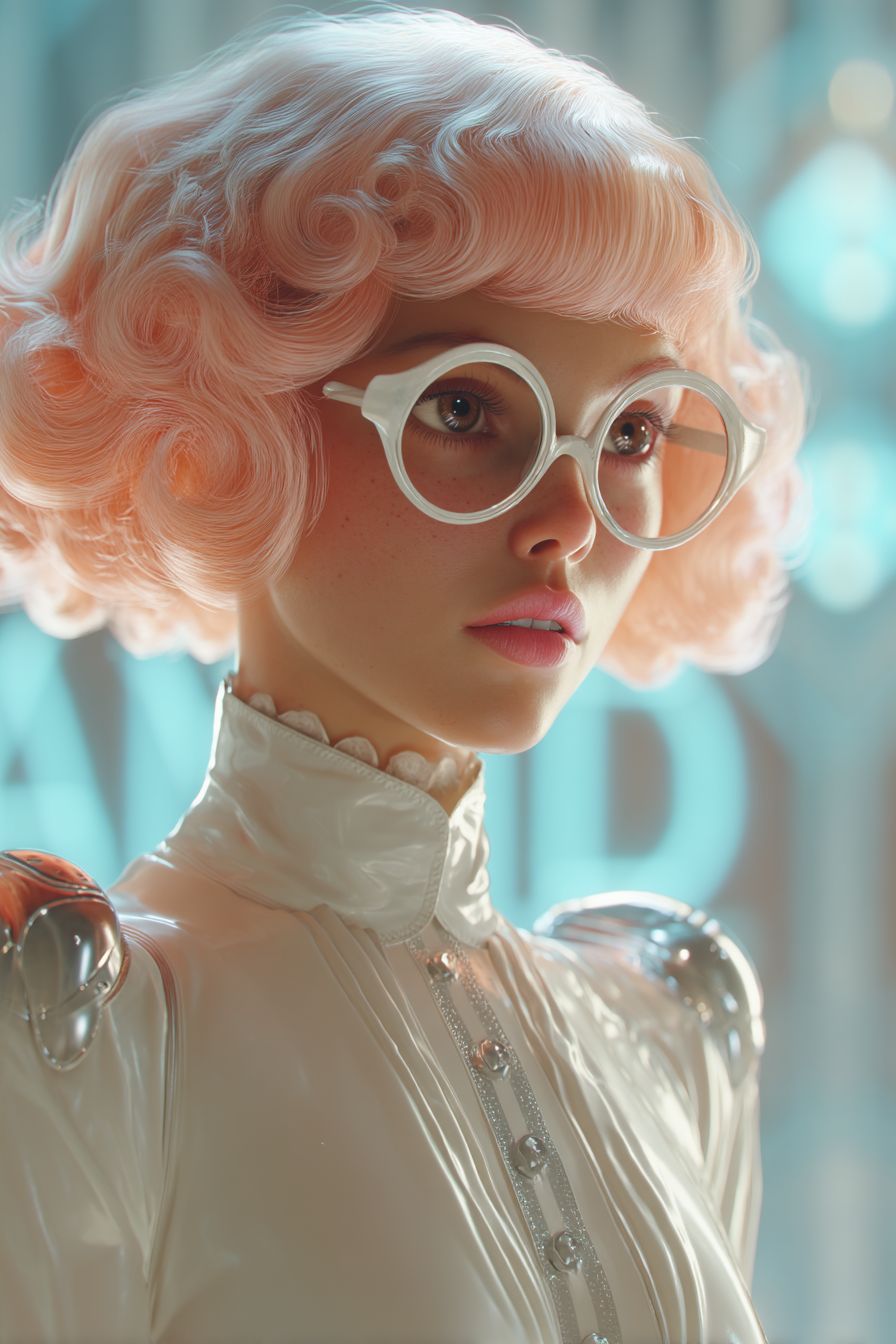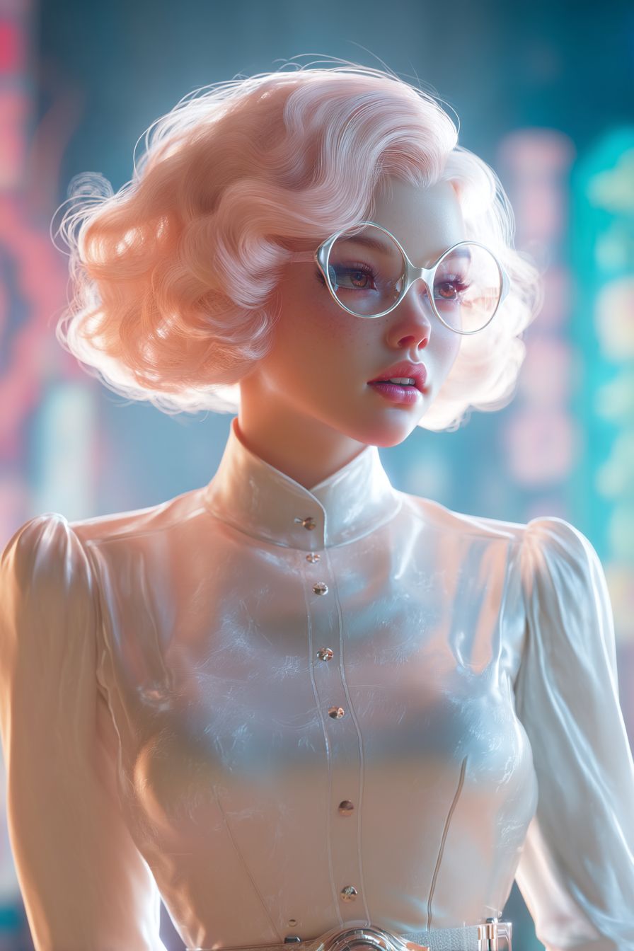 Cinematic extreme close-up of a retro atompunk 1950s woman on a neon-tinged futuristic city street, hyper-realistic CGI, extreme depth of field. She has short, voluminous pastel peach-pink hair in soft 50s-style waves and curls, framing her porcelain-pale face like a floating cloud. Her round white cat-eye glasses catch ambient light. Intricately detailed facial anatomy: delicate nose, softly sculpted cheekbones with a hint of rose, full natural lips with a sheer pink sheen, intense rose-toned eyes under finely arched brows. She wears a high-neck pearlescent white satin blouse with structured collar and tiny pearl buttons, long fitted sleeves ending in slim cuffs. Around her slim mesomorphic waist, a glossy chrome belt with subtle atomic motifs. No exaggerated curves or eroticization. Background: softly blurred atompunk skyline--sleek chrome spires, retro-futuristic neon signs, light drizzle forming glistening puddles. Dramatic cinematic lighting: cool blue backlight and warm peach key light highlight every strand of hair, wrinkle of fabric, and contour of her face. Mood: dreamy, elegant, charmingly futuristic with 1950s flair. No text, no logos, flawless anatomy. --ar 2:3 --quality 2 --v 7.0