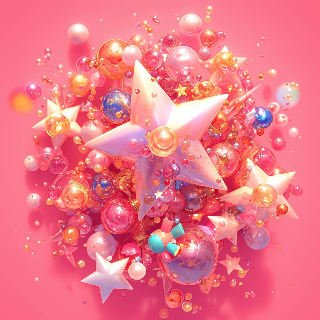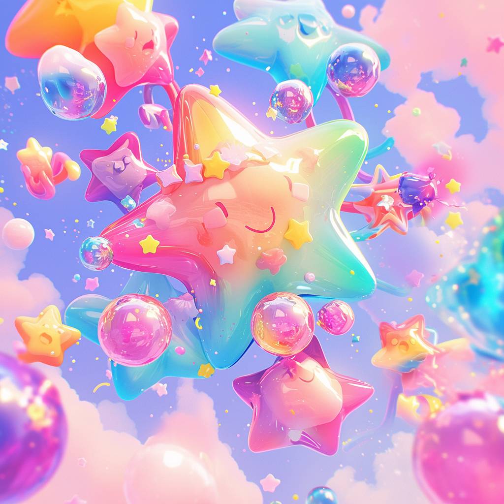 Groupe d'Art Stellaire (Stars), Pop Surréaliste, Candy Core, Eve Bunchu, Brillant/Glossy, Flou Doux, rendu dans Cinema4D, style party kei, style salon kei, Y2K, style de rendu Hallyu