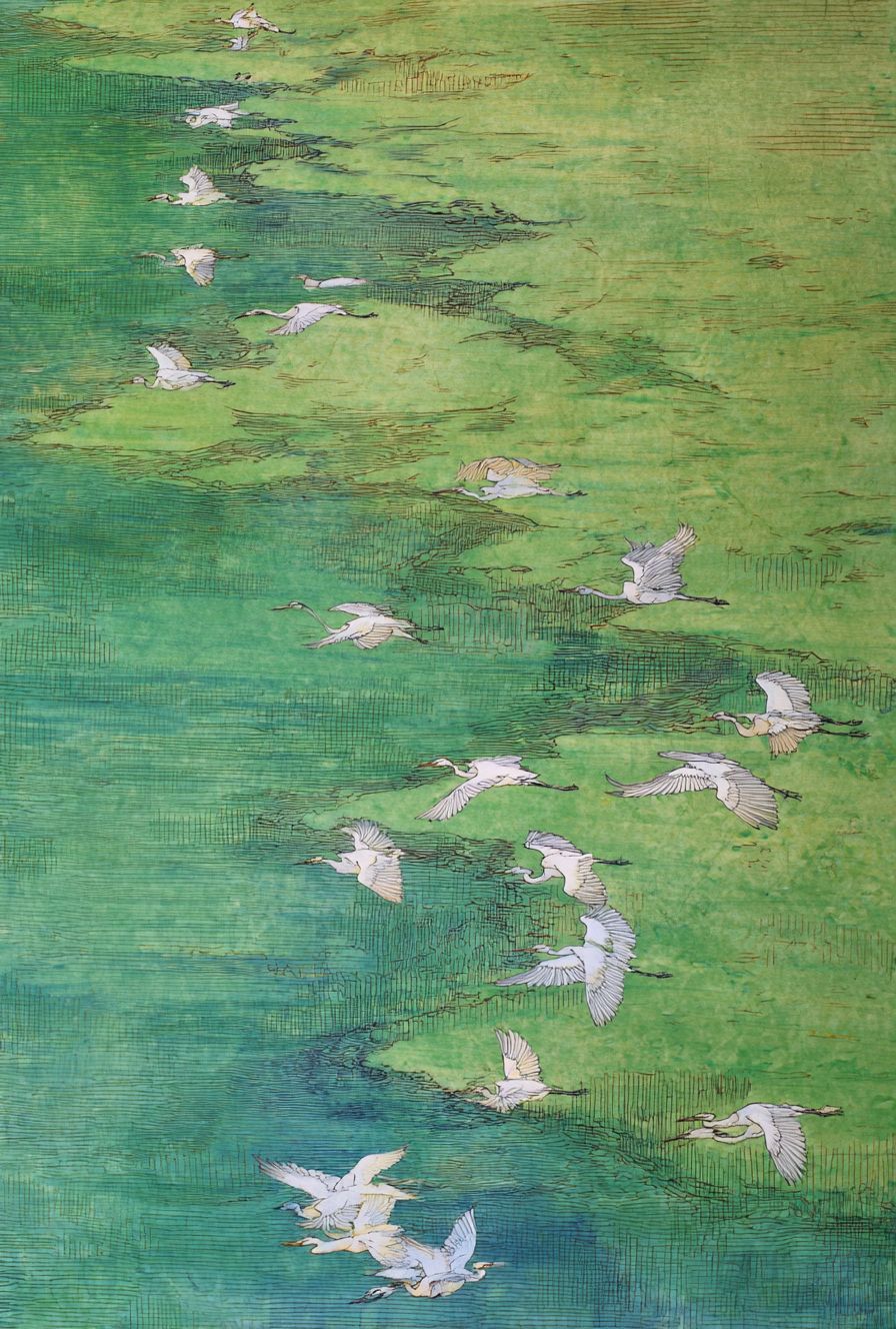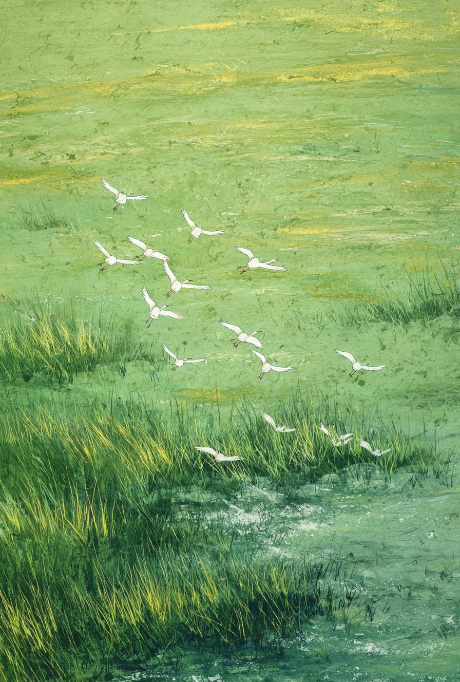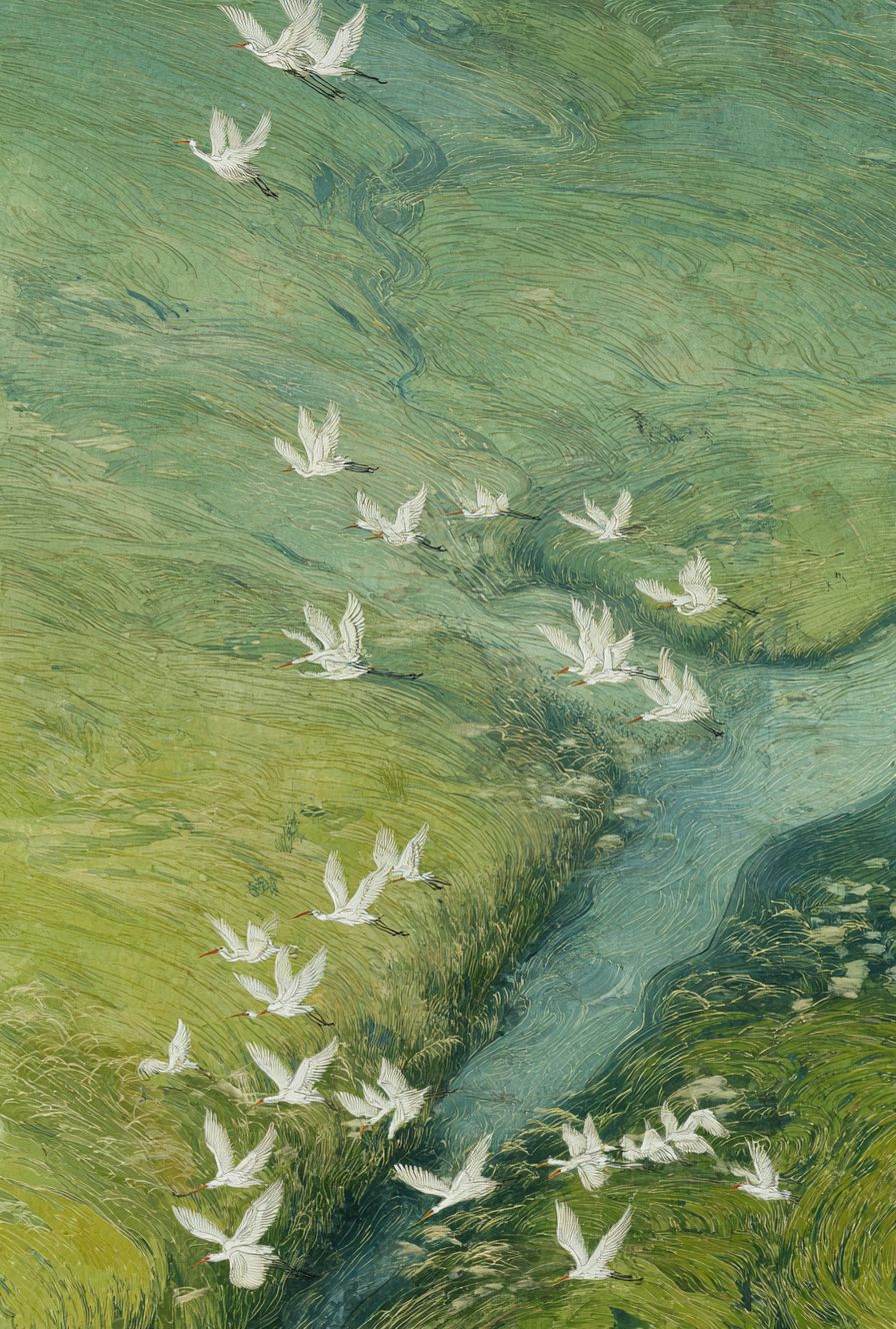 La prairie verte près de la rivière est pleine d'oiseaux blancs, volant en groupe, créant un effet pictural avec des coups de pinceau et des lignes. L'arrière-plan vert présente une surface d'eau, des tons bleu-vert clair, et un travail de pinceau méticuleux. Il possède des détails exquis, des effets d'éclairage doux et une haute définition. Une perspective vue du ciel met en valeur leur posture gracieuse.