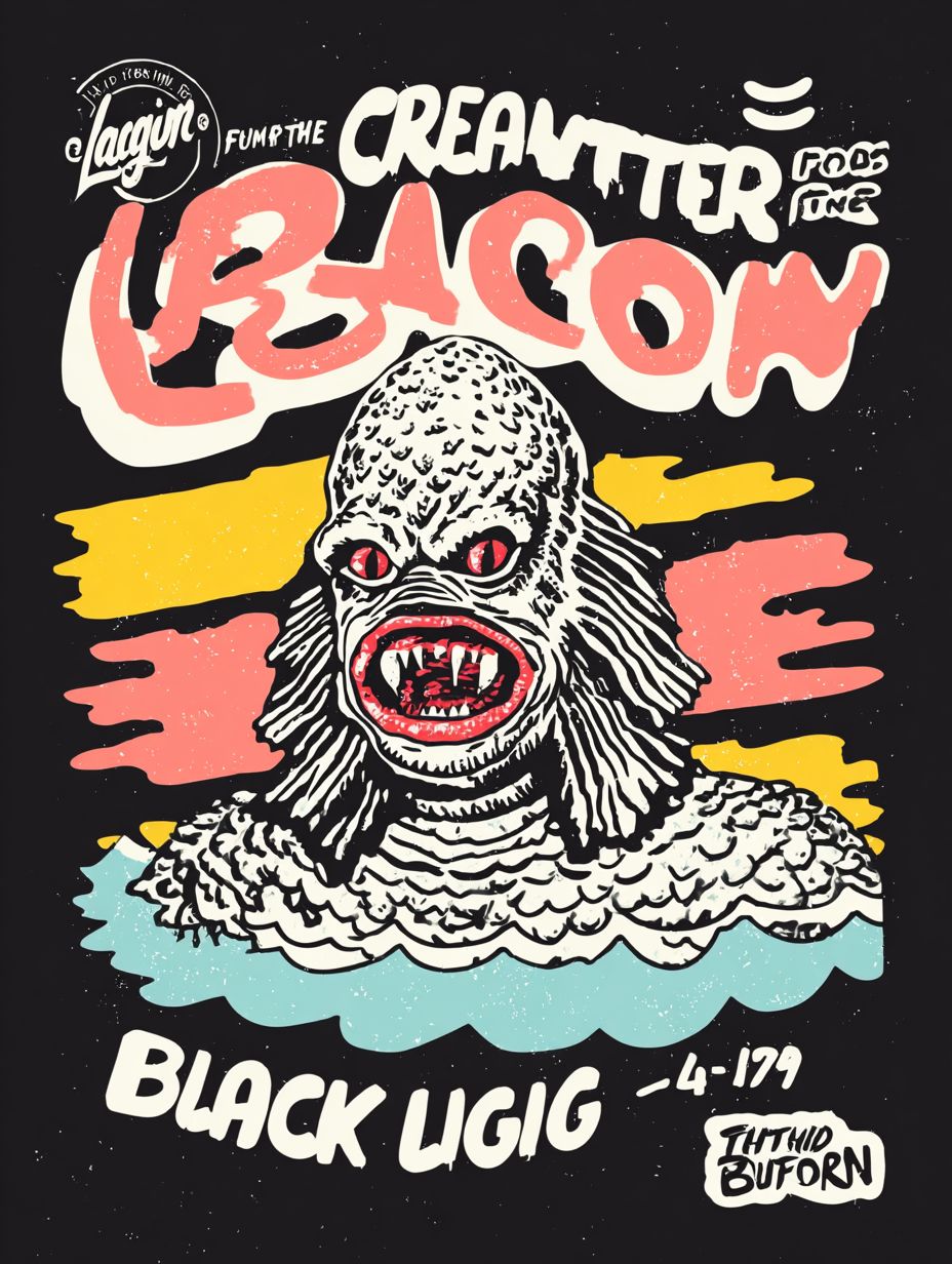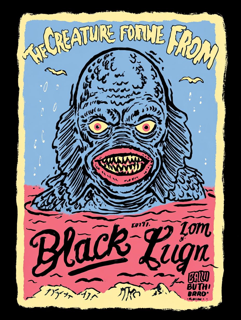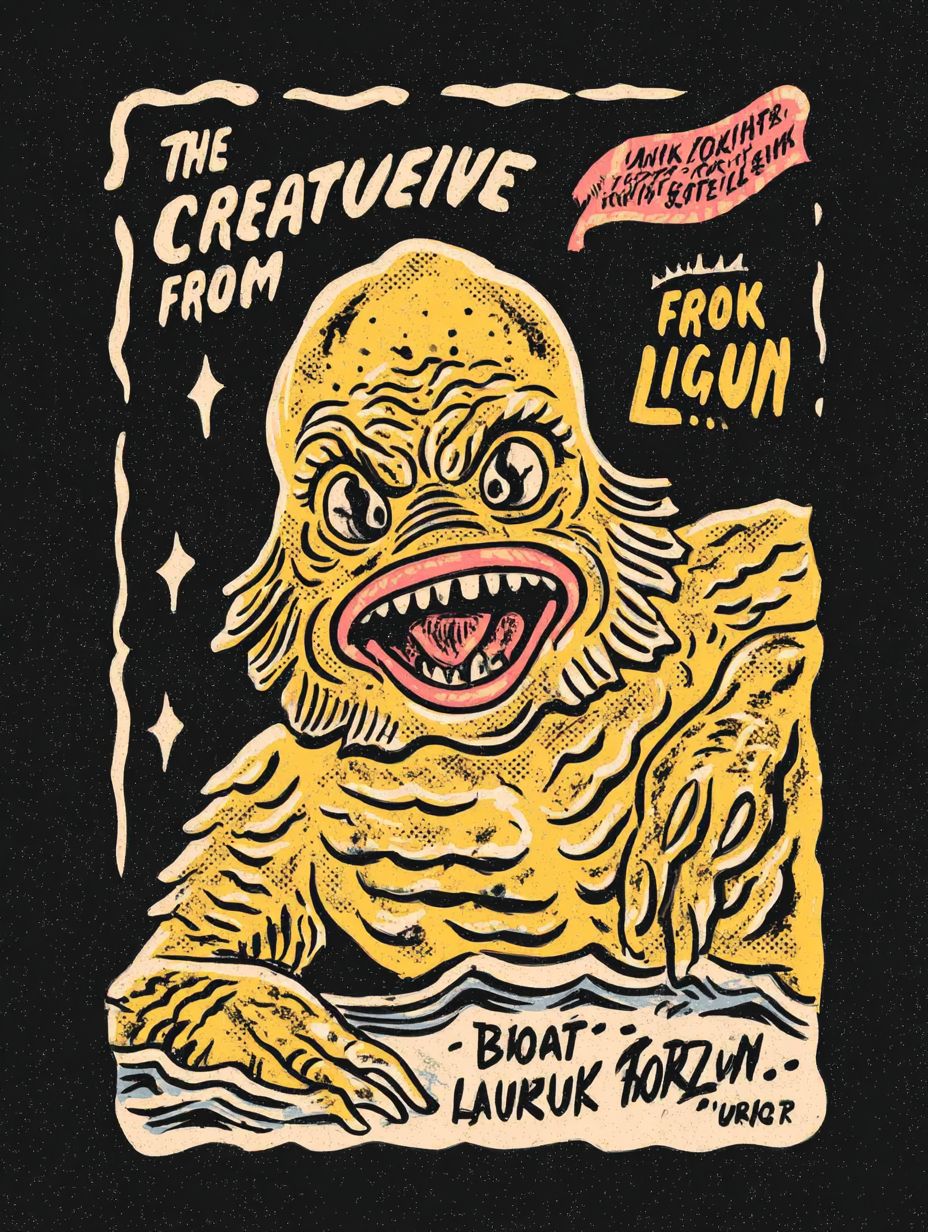 a vintage poster depicting a horror movie about the creature from the black lagoon, with the text: "The Creature From The Black Lagoon", 1940s vintage horror comic book cover, horror-inspired, horror and sci-fi themes, tim burton, iconic t shirt design isolated on black --ar 3:4 --profile tvyduea ynjaugi wpk2qus