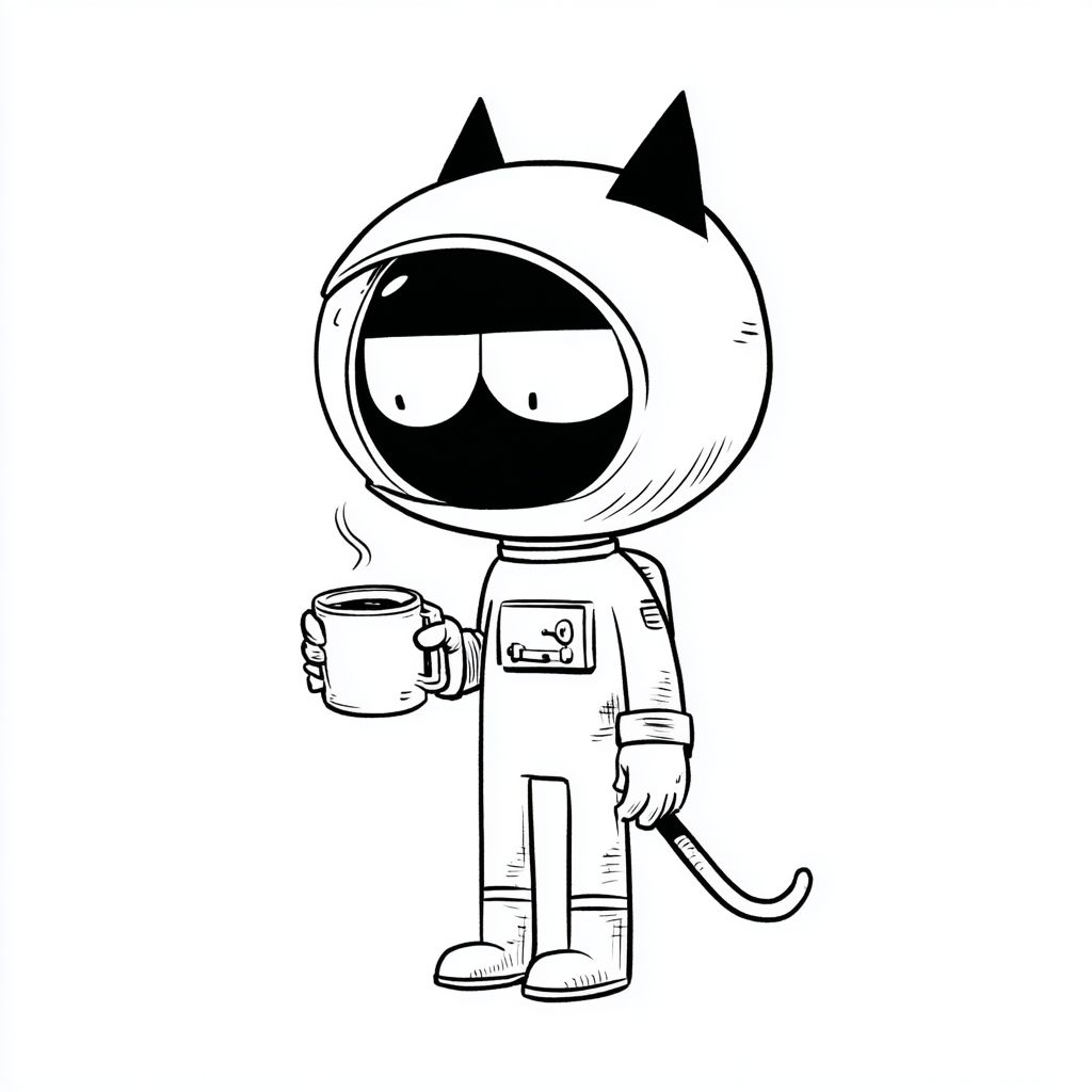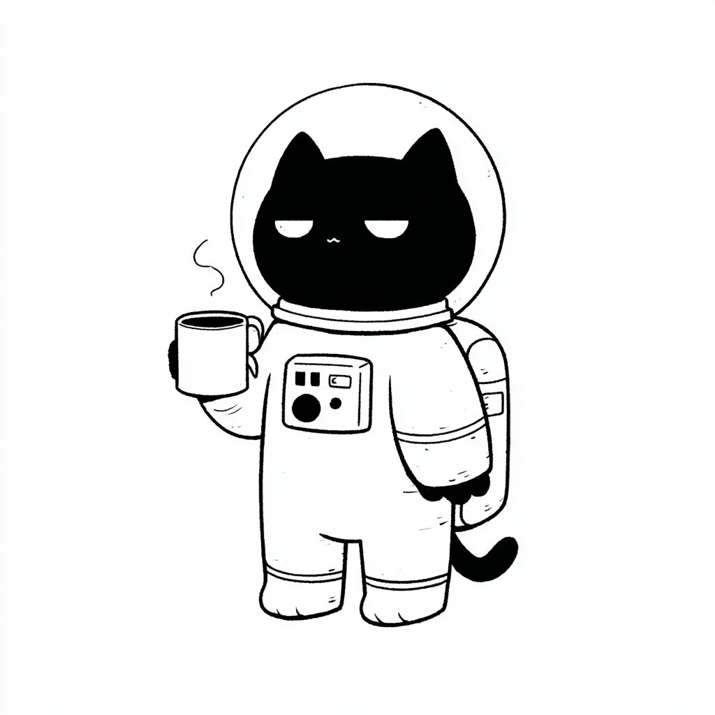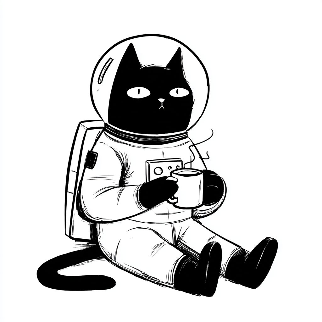 Un chat noir astronaute avec une expression sarcastique en train de boire du café sur fond blanc