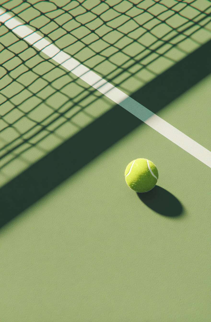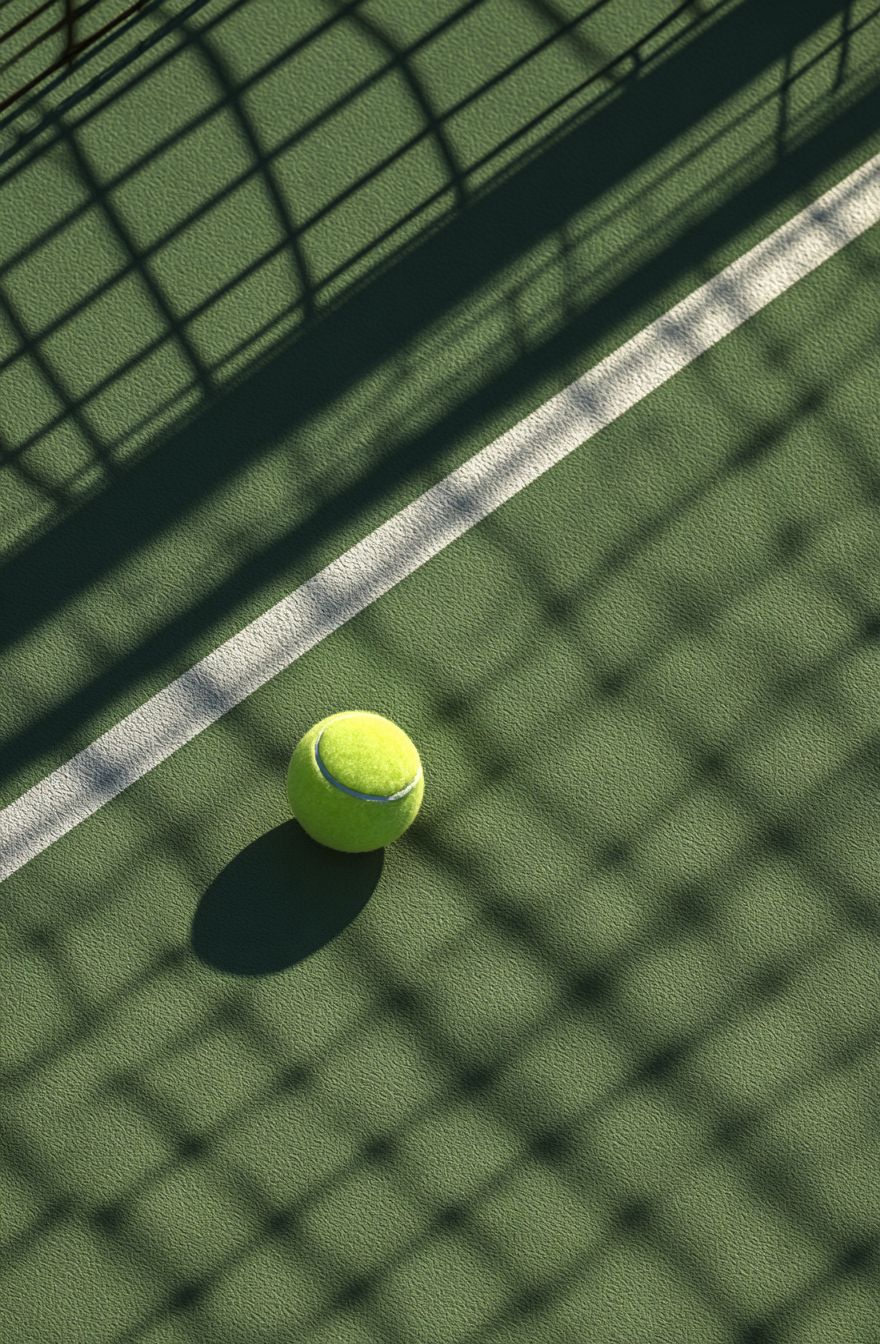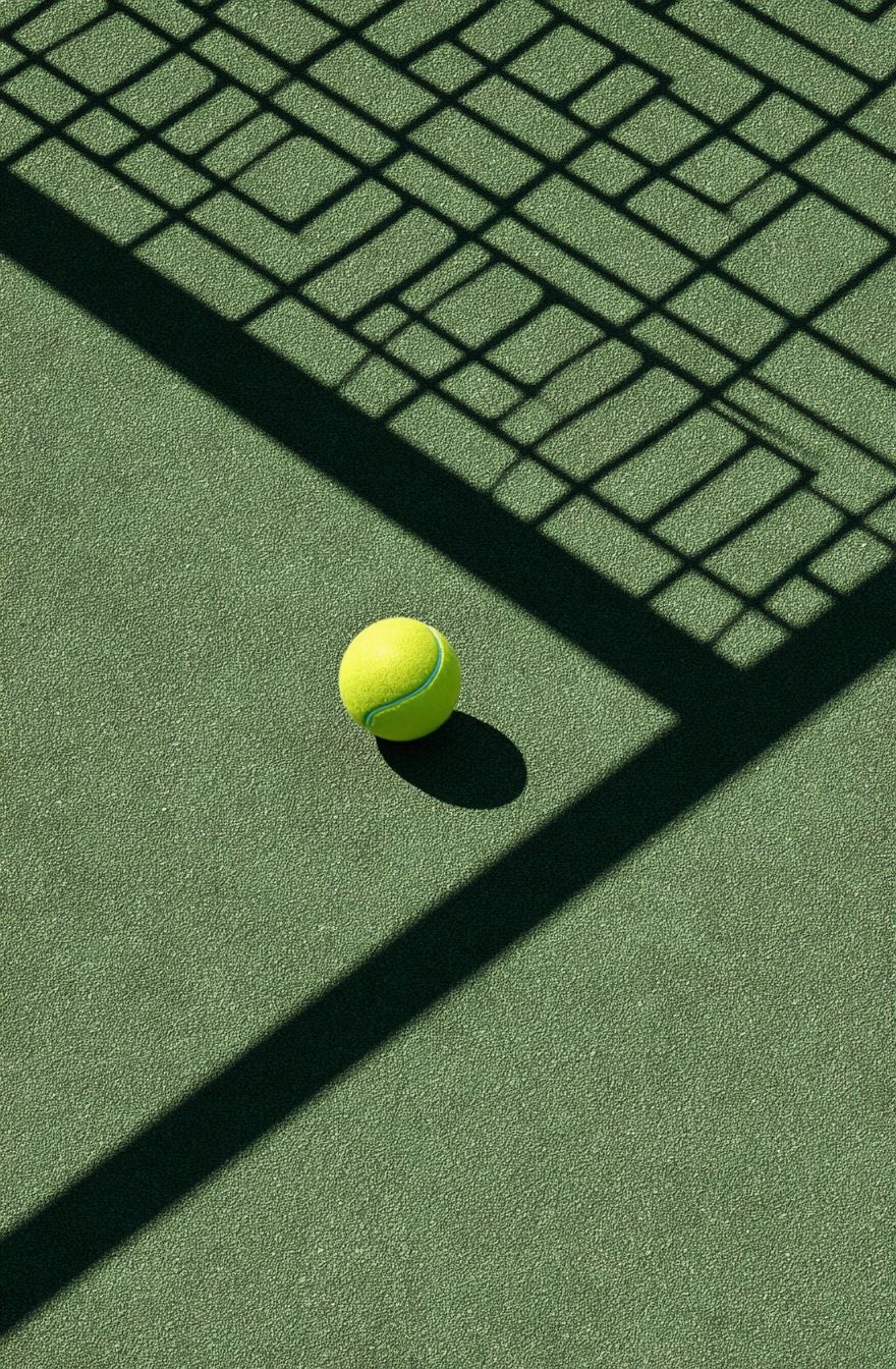 Top view of a tennis ball on a green tennis court, with the shadow of the net, soft lighting, and clean, minimalistic composition. The image has an empty space for text, showcasing photorealistic, hyperrealistic photography with cinematic lighting, created using Octane Render for commercial photography, in the style of Uncker. --ar 21:32