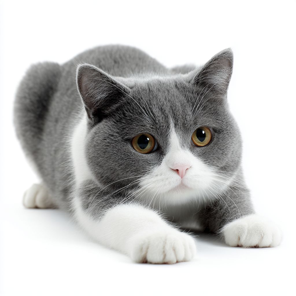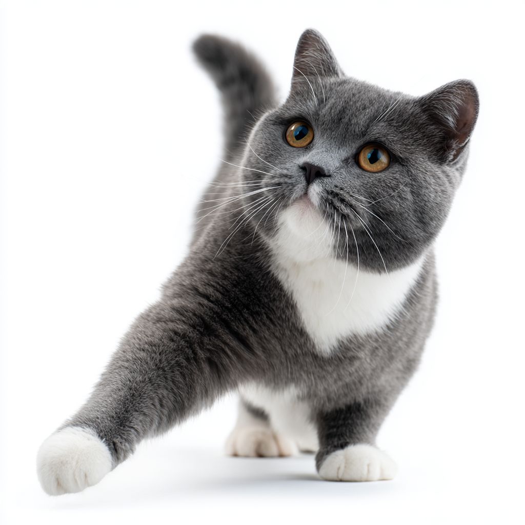 Frontal view of a cute blue and white British Shorthair cat, stretching out one front paw to the side as if ready to catch something, full body visible without cropping, pure white background, clean and simple composition.