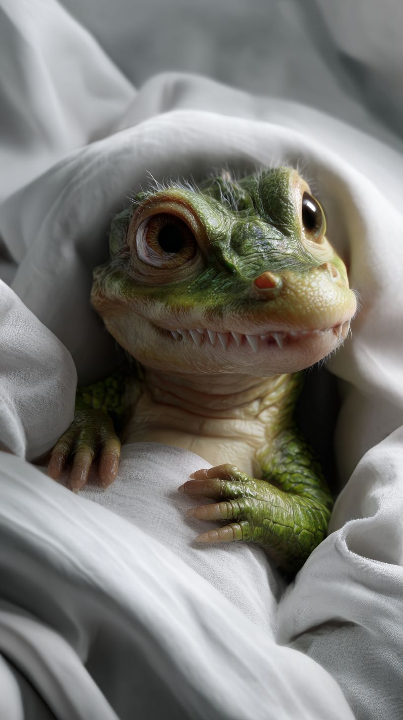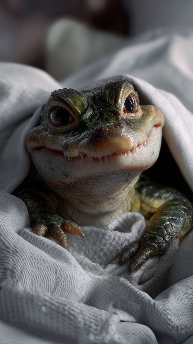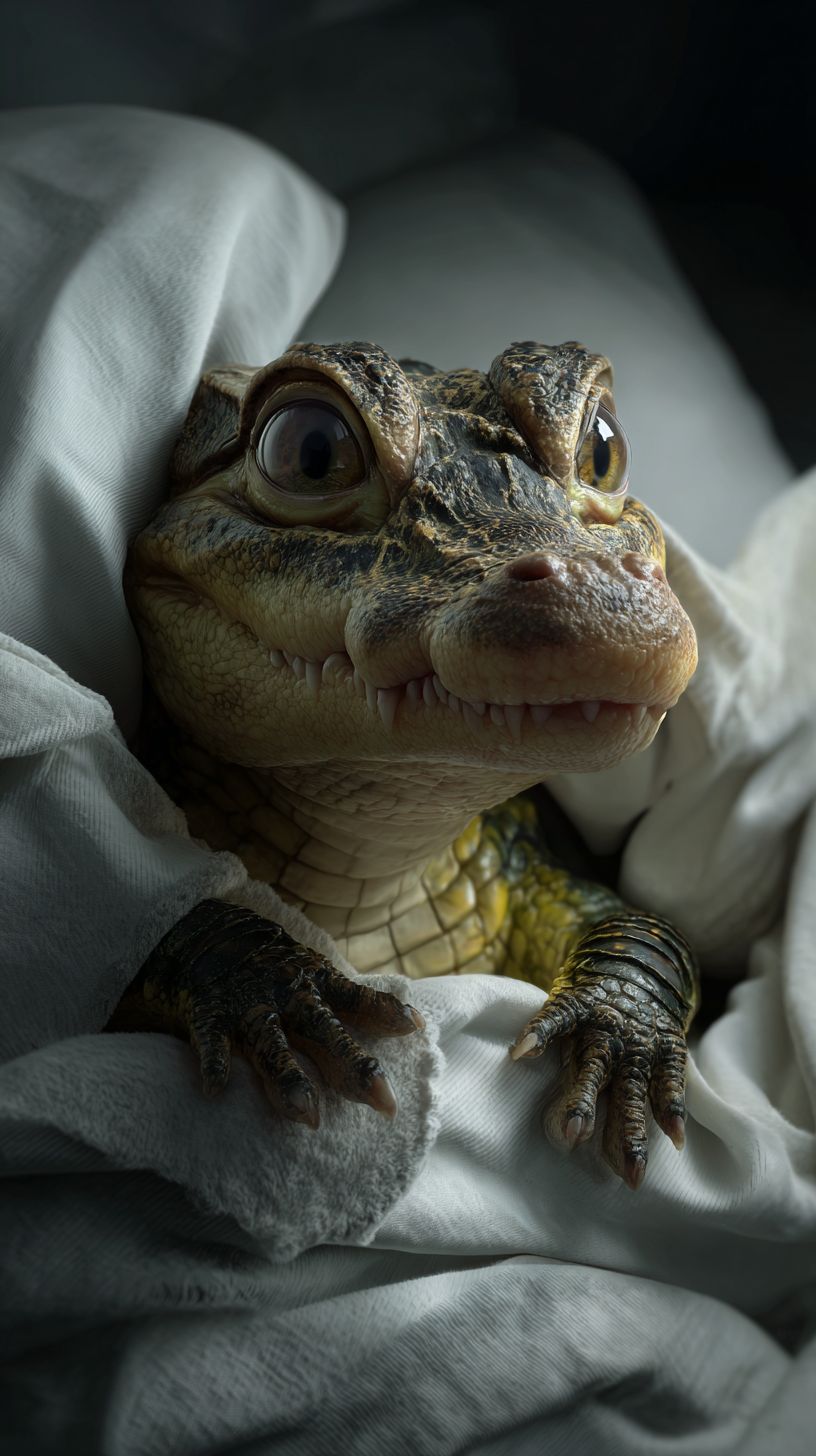 A cute baby alligator, in the style of Pixar, snuggled up in bed under the covers with a white pillow and blanket cover at night, a happy expression, big eyes, cartoon character design, bright colors, high-definition photography, and super details. --ar 9:16 --v 7.0 --p yki8oxb