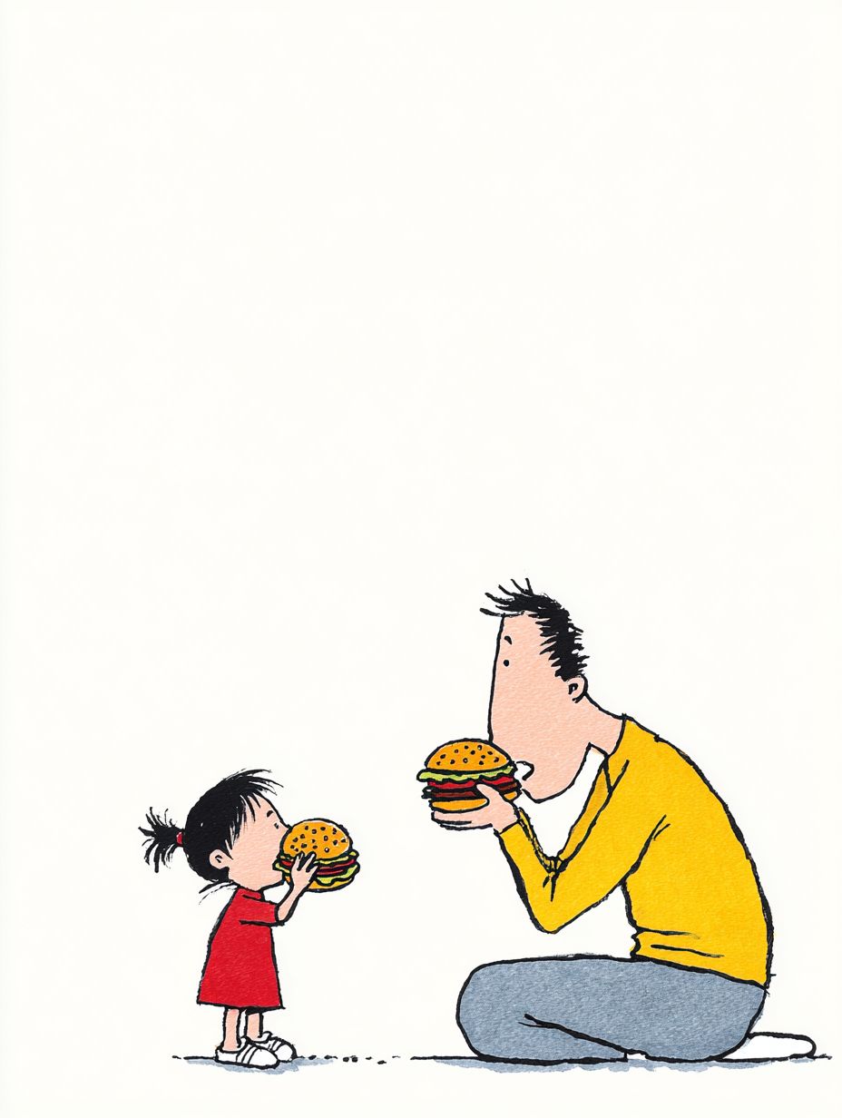 Une petite fille mange avec ses mains, tenant le hamburger devant elle et soufflant fort au visage de son papa. Le père est assis à côté d'elle, mais il n'a aucune expression sur la bouche ou le nez. Il y avait de la nourriture partout lorsque j'ai essayé de respirer de cette bouche ouverte qui a éternué. Style de bande dessinée chinoise, lignes simples, blocs de couleurs vives, design de personnage de dessin animé par Quentin Blake, portrait de corps entier, illustration plate, haute résolution.