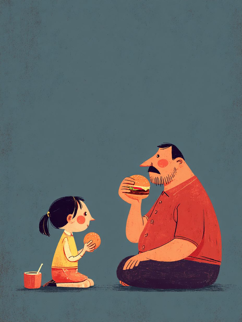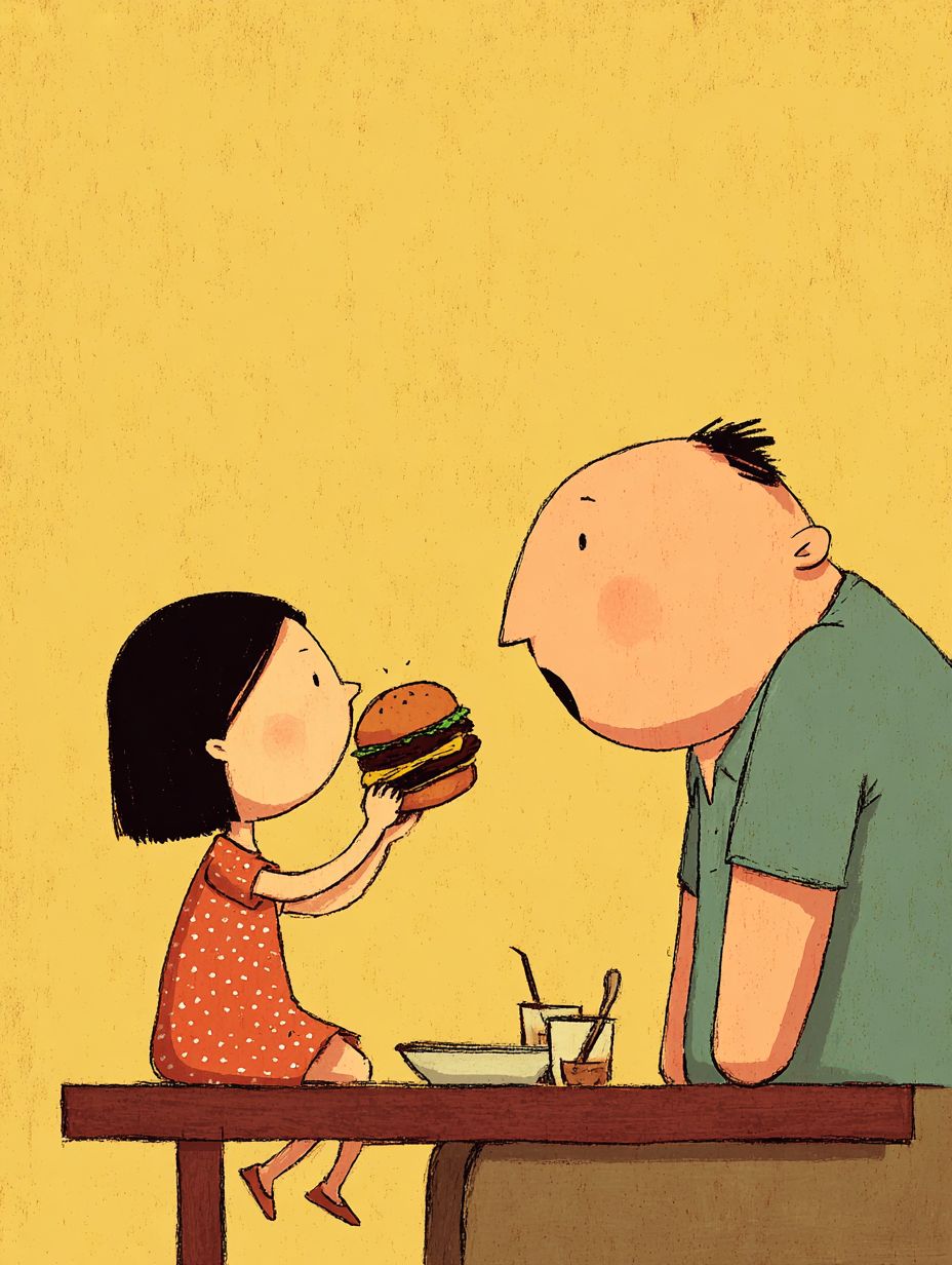 A little girl is eating with her hand, holding the burger in front of herself and blowing it hard at dad's face. The father sits on one side of him, but he has no expression on his mouth or nose. There was food all over my when I trying to breath from eath that sneezed out of an open mouth. Chinese comic style. simple lines, bold color blocks, cartoon character design by Quentin Blake, full body portrait, flat illustration. high resolution. --ar 3:4 --v 7.0