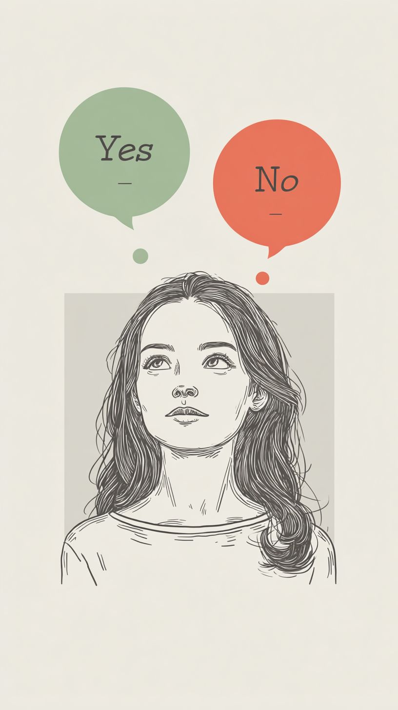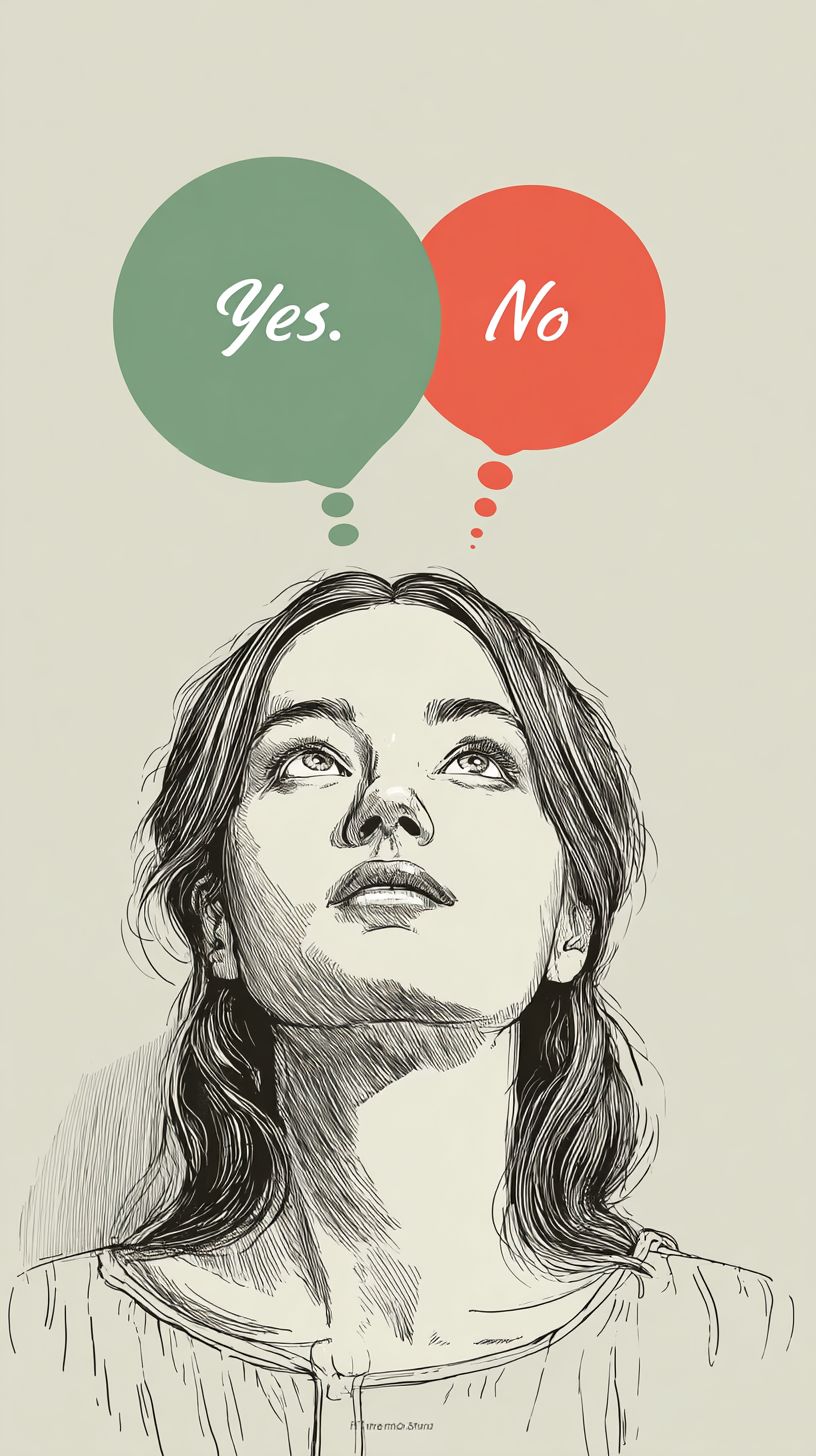 Minimal line-art illustration, monochrome lines with accent colors. A woman thinking, eyes looking upward. Two rounded speech bubbles above her head labeled "Yes" (green) and "No" (red), simple flat fill, tiny shadow, balanced layout. Very light gradient background, large empty space for headline, ultra clean. --ar 9:16 --v 7.0