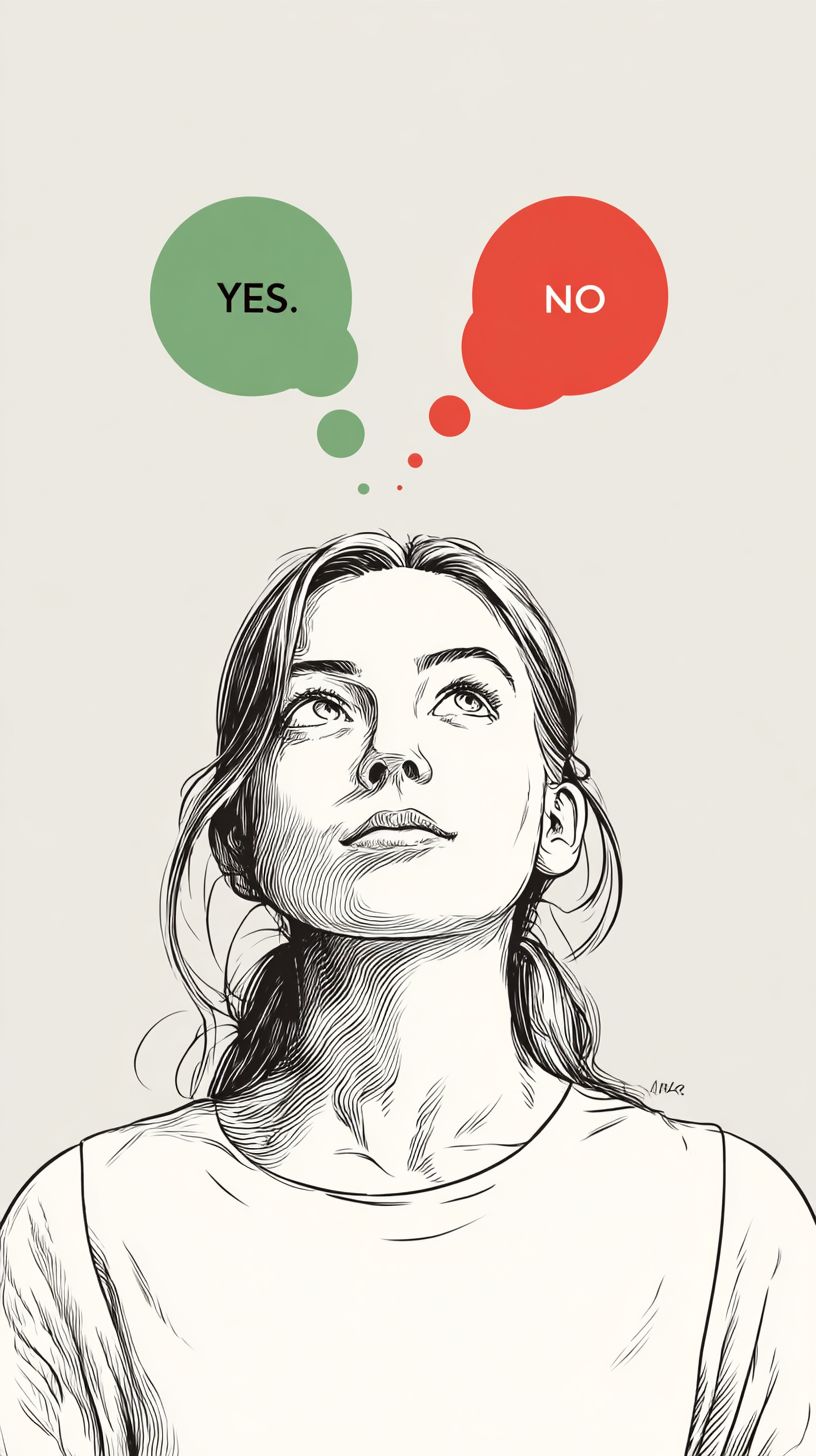Illustration minimaliste en art linéaire, lignes monochromes avec des couleurs d'accent. Une femme en train de penser, les yeux levés. Deux bulles de dialogue arrondies au-dessus de sa tête étiquetées 'Oui' (vert) et 'Non' (rouge), remplissage simple et plat, petite ombre, mise en page équilibrée. Fond de dégradé très léger, grand espace vide pour le titre, ultra propre.