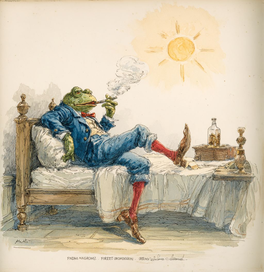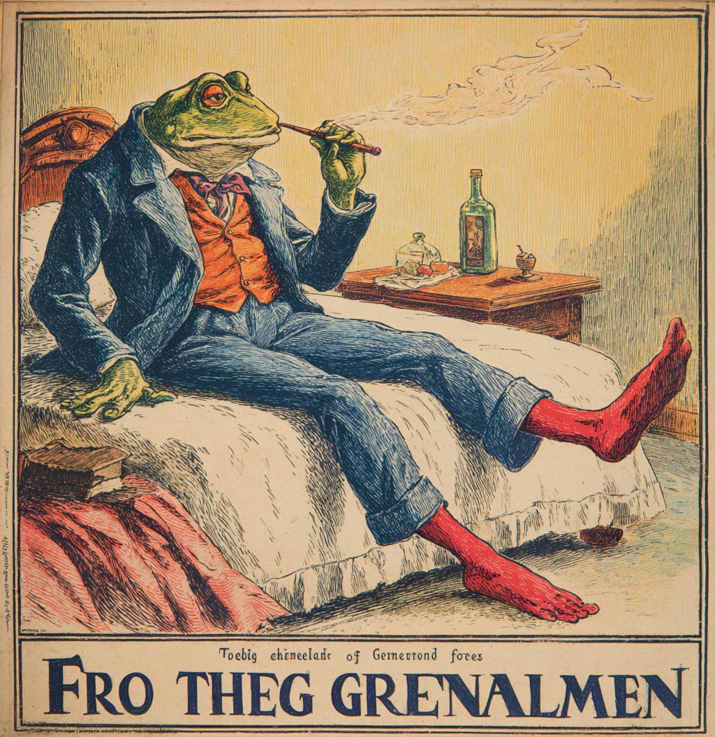 a children's illustration picture fading into a white edge, vignette, stylized in the style of an old nursery rhyme or fairy tale about "the frog gentleman". the character is depicted as being large and muscular with long legs, wearing red socks on his feet, blue trousers, and a suit jacket. he has green skin coloration and he is smoking. a small round bottle sits beside him on top of a table, with smoke coming from it. he is sitting by himself at one end of a bed, which lies under the sun. --ar 36:37 --v 7.0
