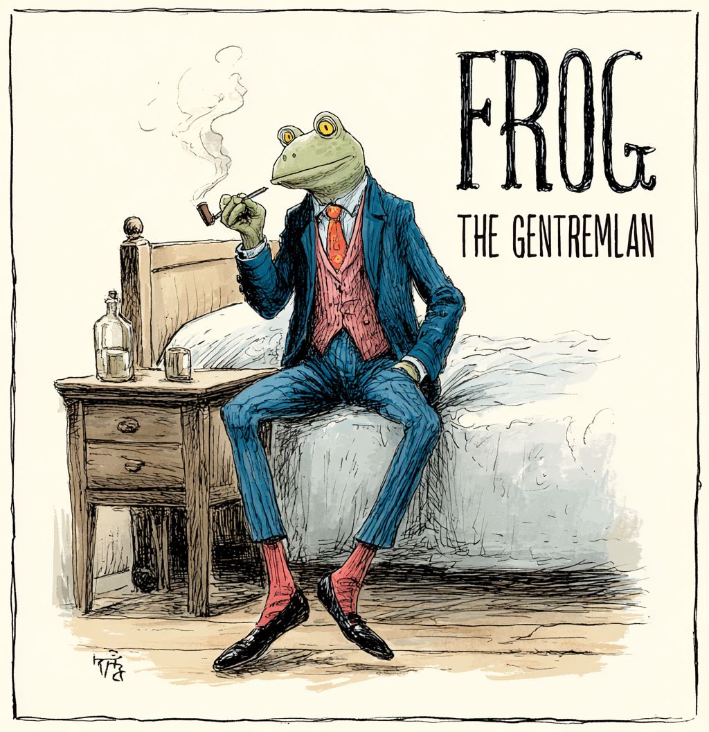 Une image d'illustration pour enfants se fondant dans un bord blanc, vignette, stylisée dans le style d'une ancienne comptine ou d'un conte de fées sur 'le gentleman grenouille'. Le personnage est représenté comme grand et musclé avec de longues jambes, portant des chaussettes rouges aux pieds, un pantalon bleu et une veste de costume. Il a une coloration de peau verte et il fume. Une petite bouteille ronde est posée à ses côtés sur une table, avec de la fumée qui s'échappe. Il est assis seul à une extrémité d'un lit, qui se trouve sous le soleil.
