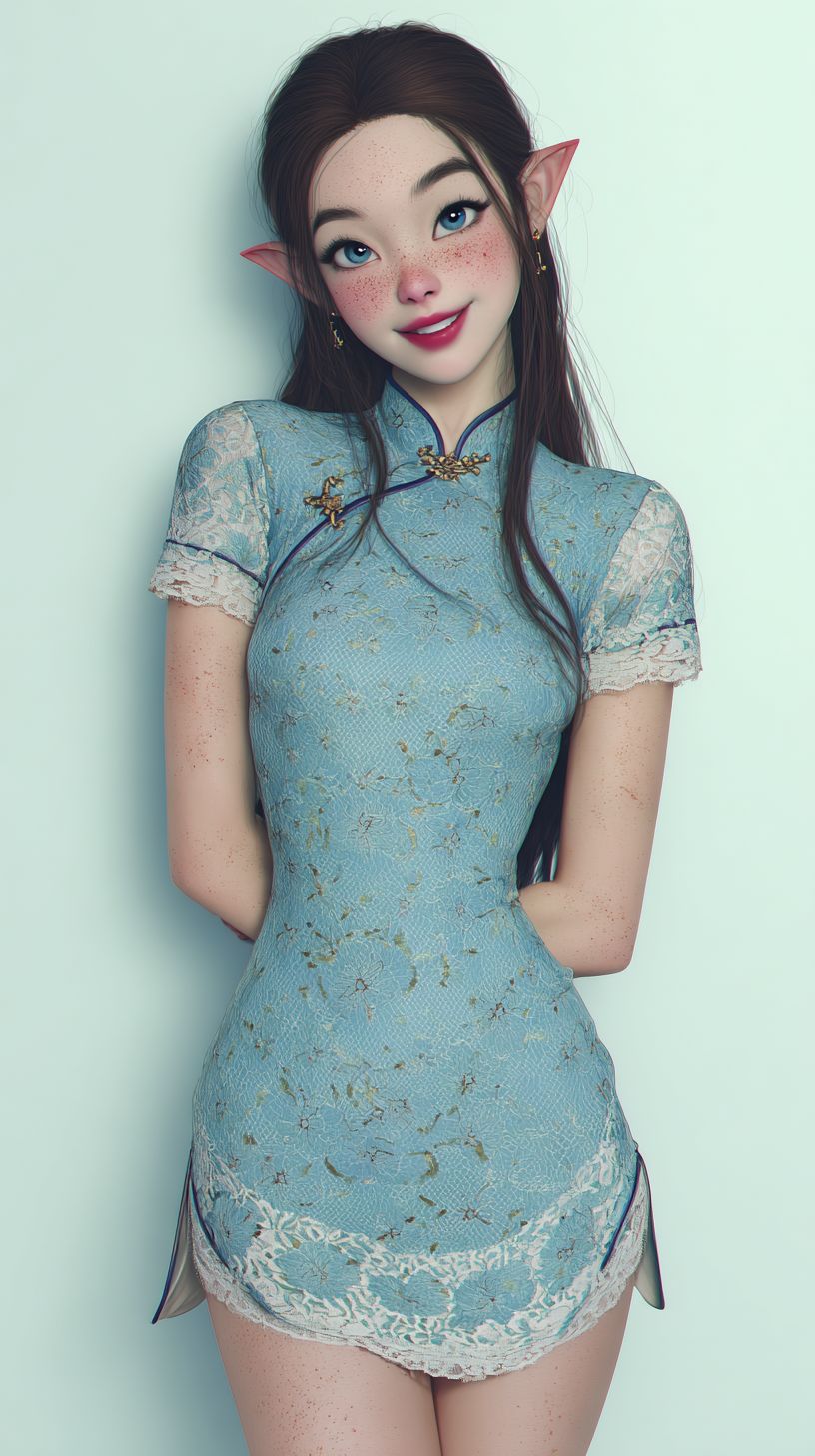Personnage féminin de Disney, portant un cheongsam court en dentelle ajusté, cheveux longs et fluides de manière réaliste, sourire doux, taches de rousseur, oreilles d'elfe, rouge à lèvres.