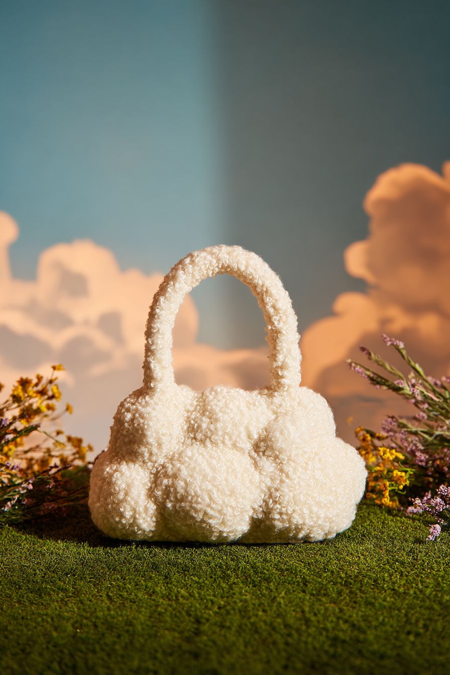 A handbag made of white wool in the shape of clouds, product photography, spring background, green grass, studio lighting, front view, warm colors, product shot, highresolution photography, detailed texture, detailed background, luxurious and elegant style, luxury brand design. --ar 2:3 --stylize 50 --v 7.0