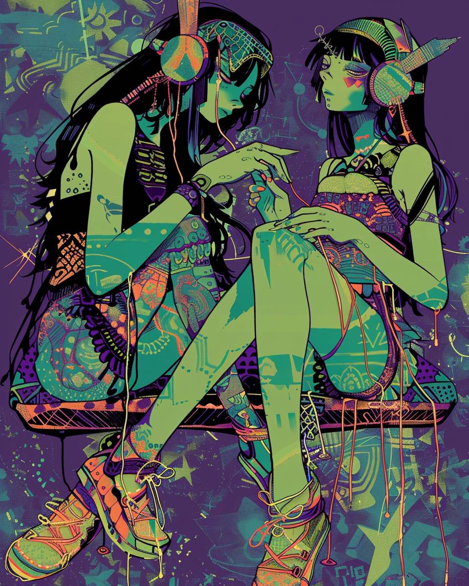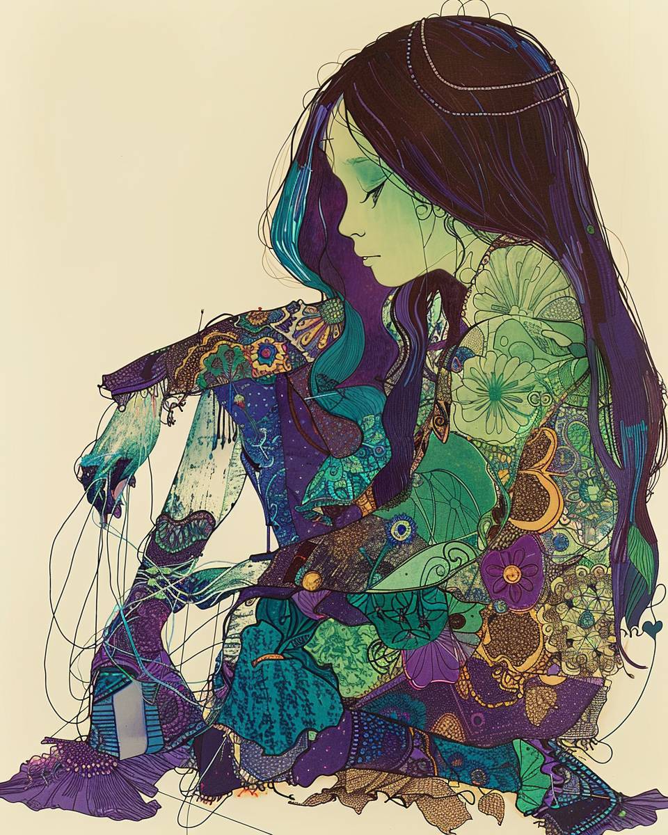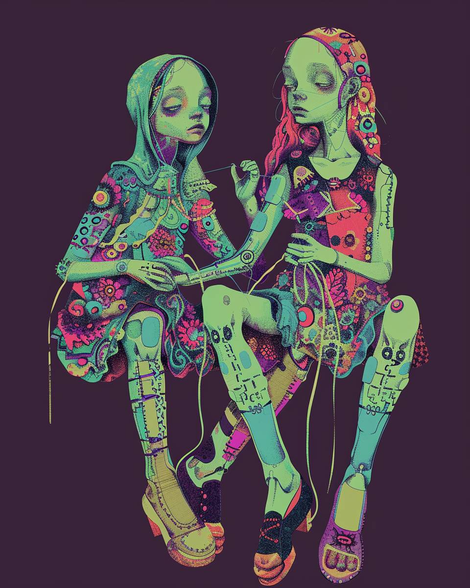 A girl with long legs is sitting next to another girl, they have threads and sewing needles in their hands, they sew each other to each other, one girl has light green skin and is covered with patches of fabric, the girls are dependent on each other, they look like dolls , in the style of surreal abstraction, neo-traditional japanese, cyan green and dark purple , dreamlike illustration, inuit art, colorized, fashion-illustration --ar 51:64 --v 6.0