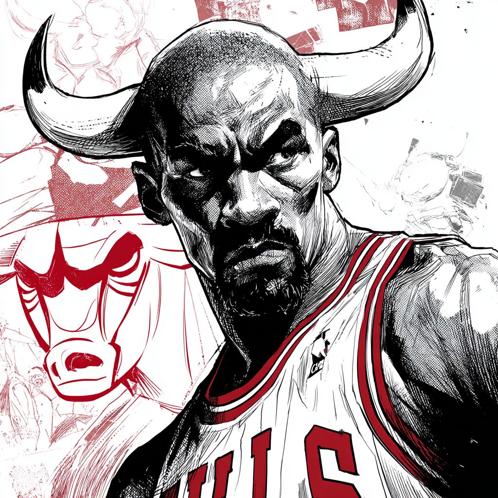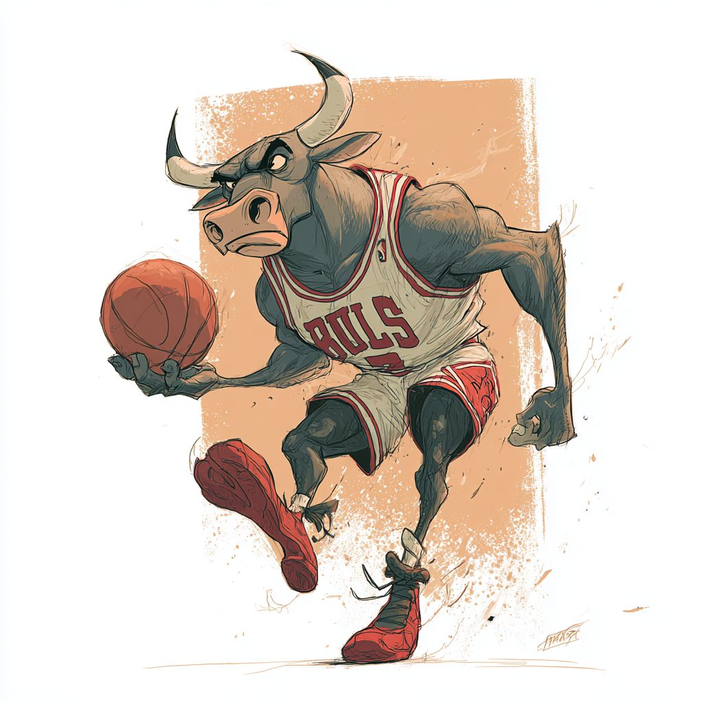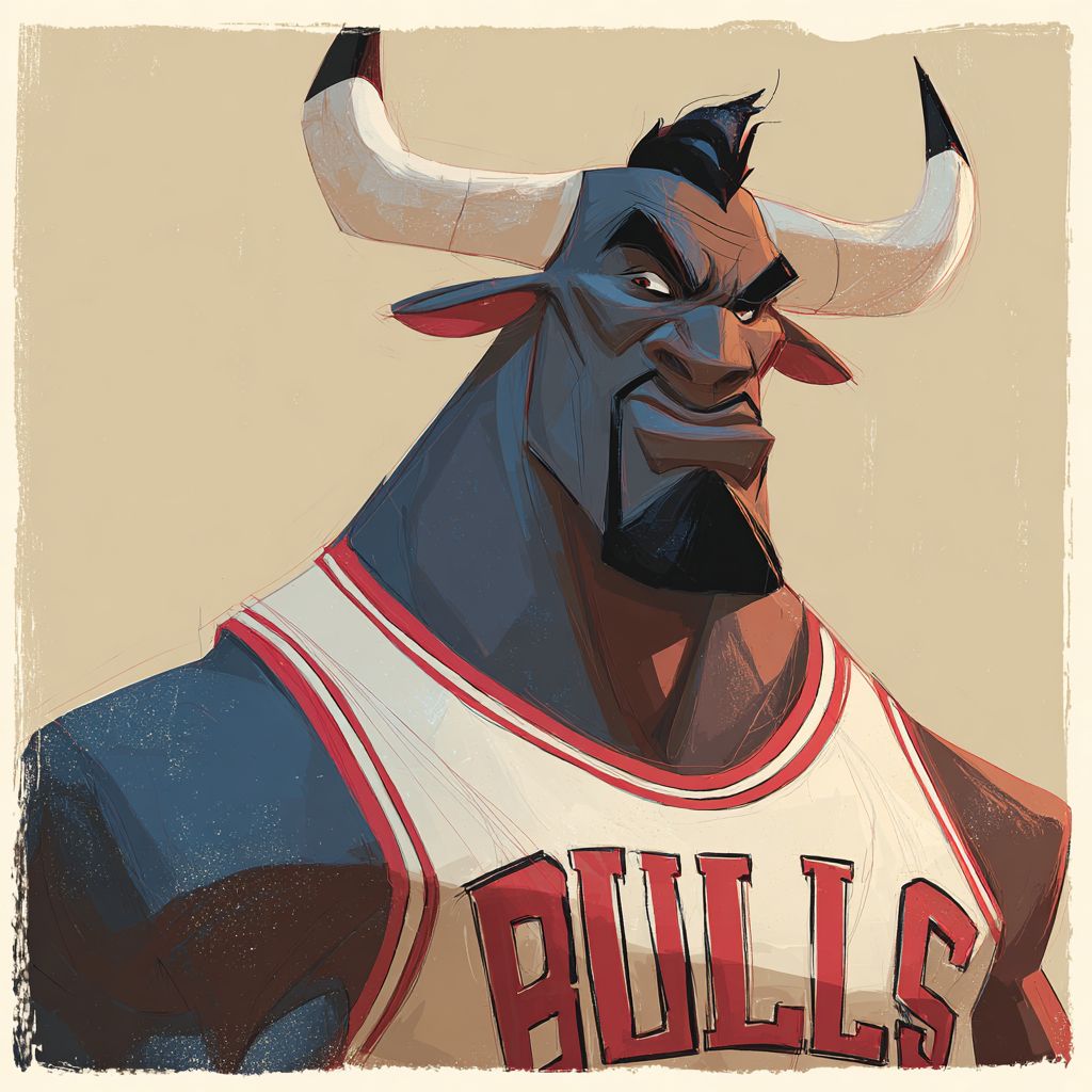 Je veux créer un personnage de bande dessinée fortement inspiré par Walt Disney, un joueur de basket avec une tête de taureau portant un maillot des Chicago Bulls dans les couleurs blanc, noir et rouge
