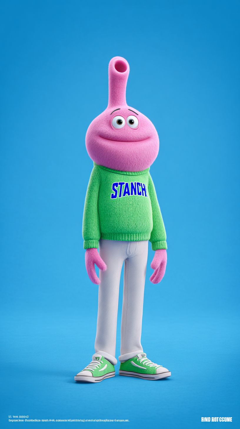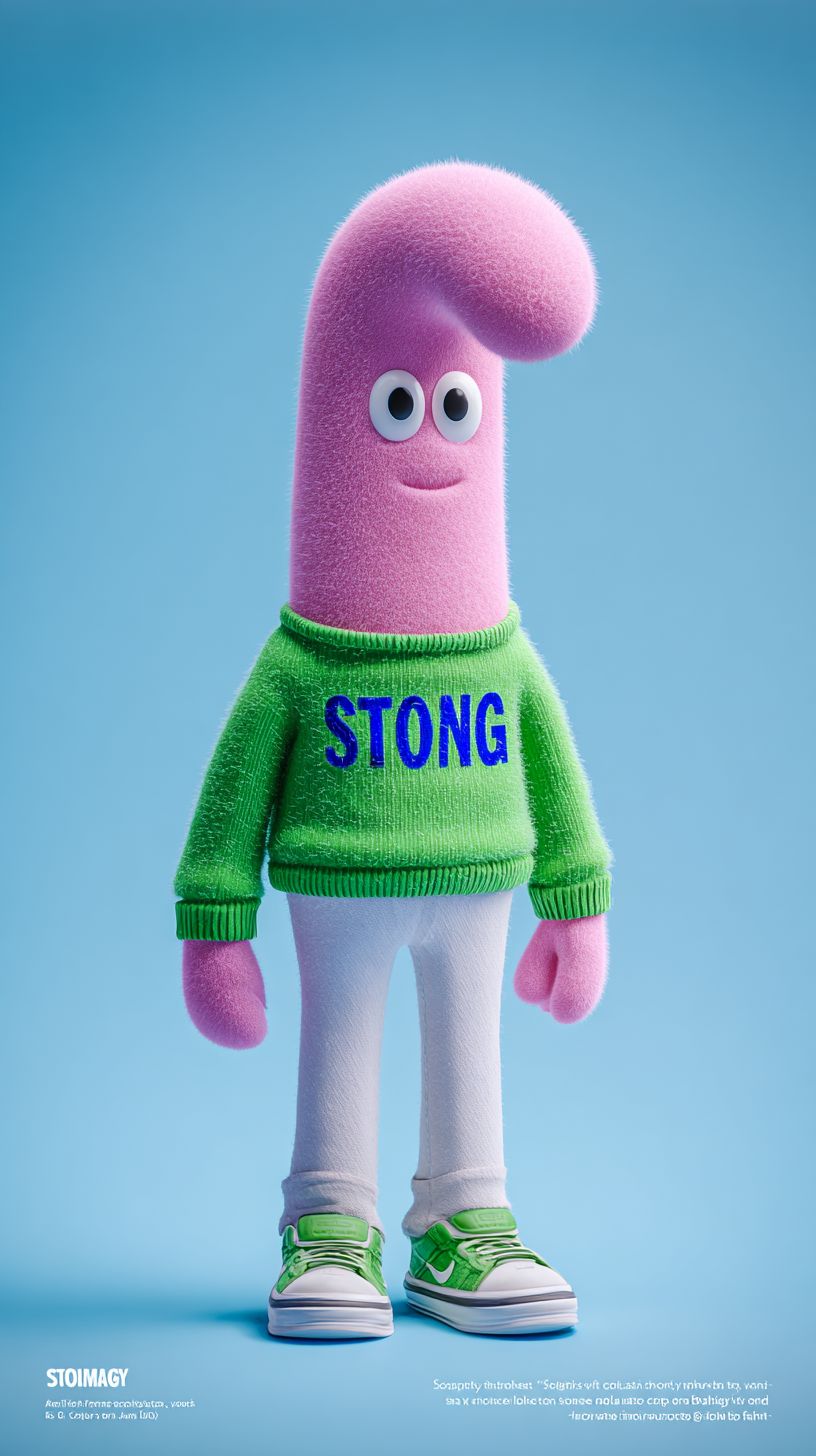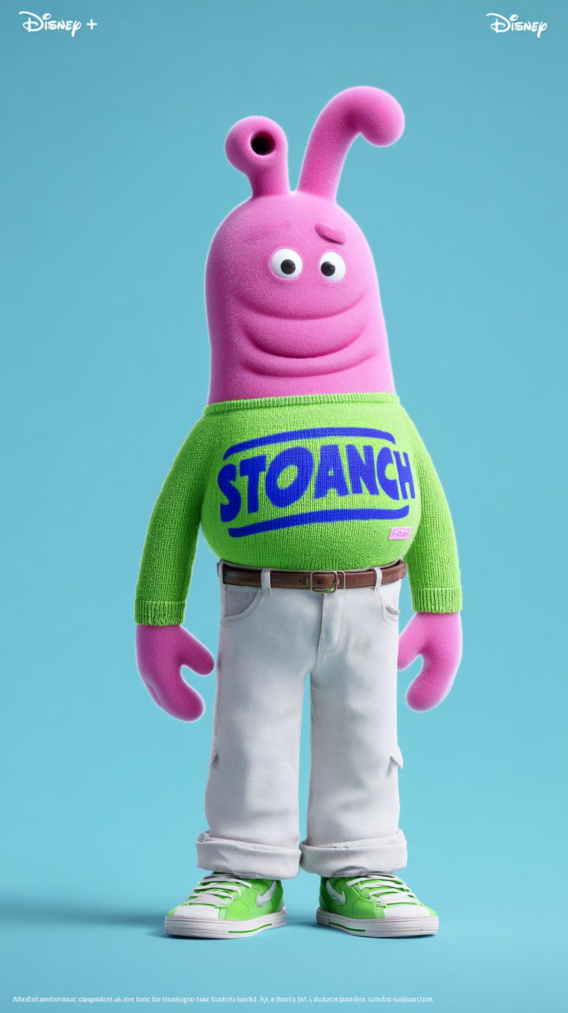 Adopting the style of Pixar's 3D animation combined with the American comic style, there is a pink anthropomorphic belly-shaped character. His head is completely in the form of an anthropomorphic stomach. There is a short, straight and top-opened hollow tubular protruding structure in the upper right corner of his head, which is used to imitate the connection part between the esophagus and the stomach. His entire body has a slightly rough sandpaper texture, and his slender yet harmonious limbs form a contrast. He is wearing a green round-neck sweater with the blue "STOMACH" printed on the front, white trousers, and green sports shoes. The color system is bright and vivid, with high saturation color collisions, maintaining the friendly feeling of the cartoon. The character is anthropomorphized as "the stomach", with a happy and confident expression. His hands are naturally hanging down and he stands there, with a light blue background. Using a smooth and bright texture style, it presents an interesting American animation aesthetic and European animation tone. The overall texture is the expression of texture, making the character have a three-dimensional volume, yet like being softened by clay or fluid shaping, full of childlike charm; the expression and posture convey a confident, lively and slightly playful American cartoon character tone, the overall atmosphere is relaxed and joyful, and through cartoon processing, it eliminates the stiffness and turns towards a "fun and affinity combined" visual experience. --ar 9:16