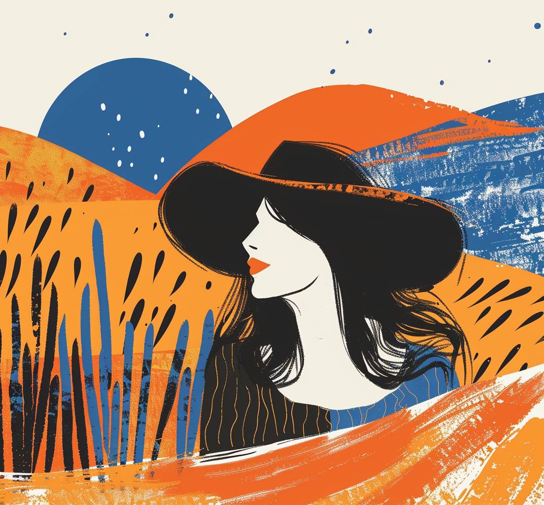 Une illustration dessinée à la main, représentant une femme avec un chapeau en train de faire de la randonnée dans le champ, sous le soleil, avec des couleurs vives comme l'orange, le noir et le bleu, et des lignes audacieuses.