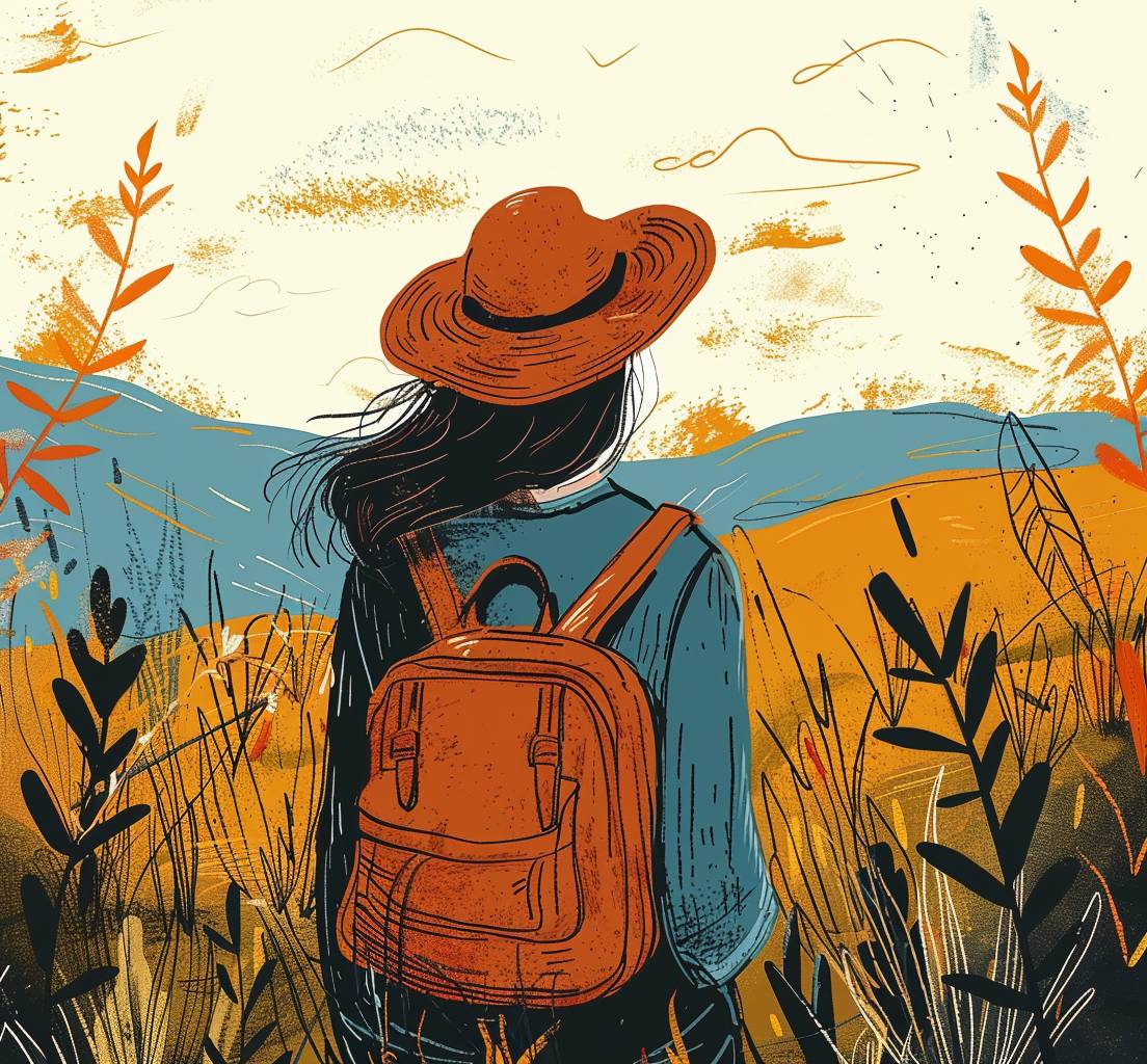 Une illustration dessinée à la main, représentant une femme avec un chapeau, faisant de la randonnée dans un champ ensoleillé, avec des couleurs vives telles que l'orange, le noir et le bleu, et des lignes audacieuses.