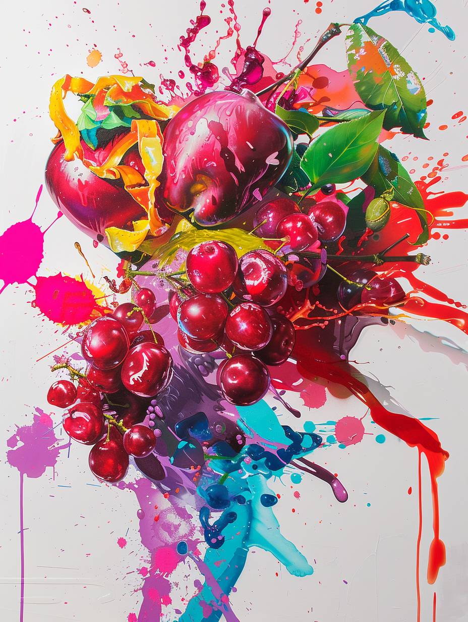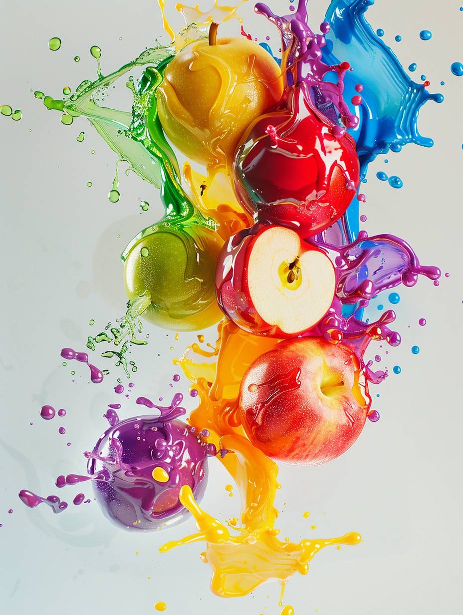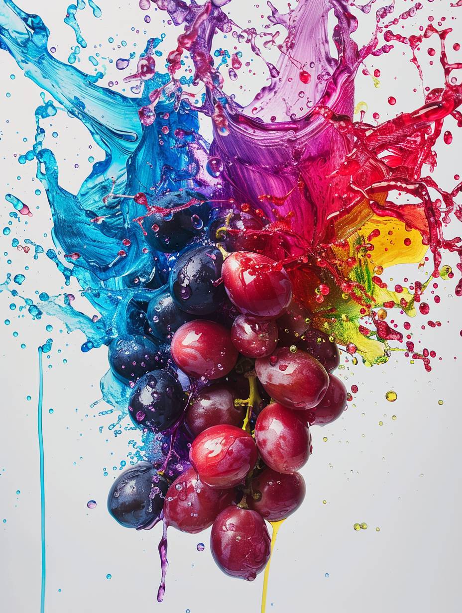 graffiti painting ,【Malic centric notes of red grape, Red apple, balanced with refreshing lemon peel, and floral oolong tea.】,【White Background】,oil splash, rainbow color, shadow. rubber, volumetric lighting, pulp painting, image realism, wide color lighting, cinematic lighting, backlight --ar 3:4 --v 6.0