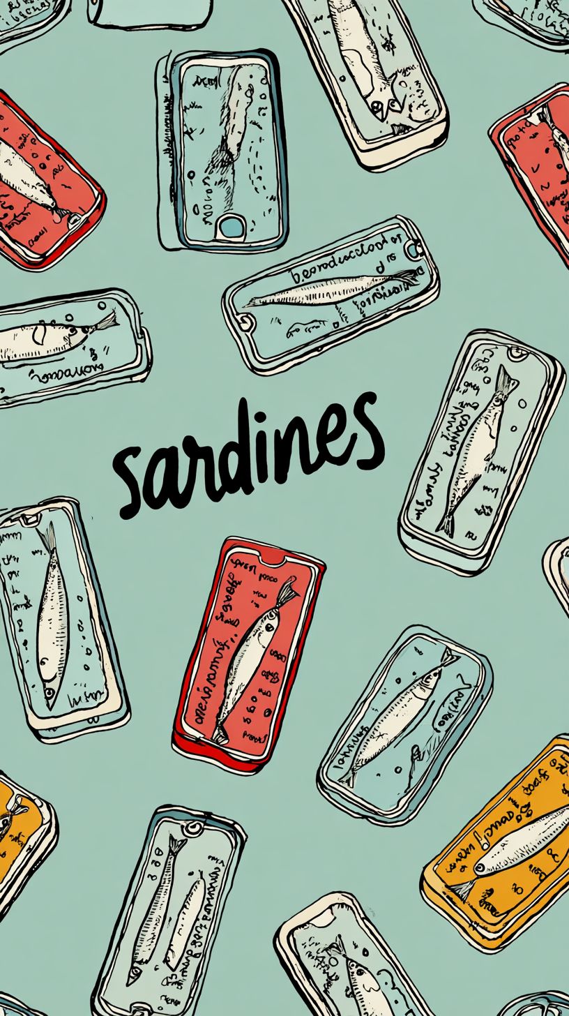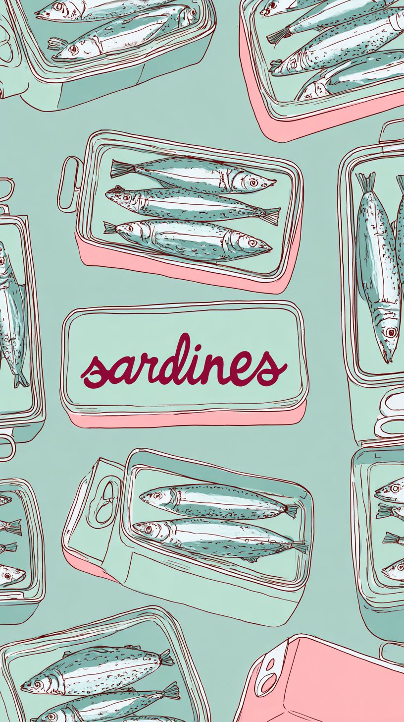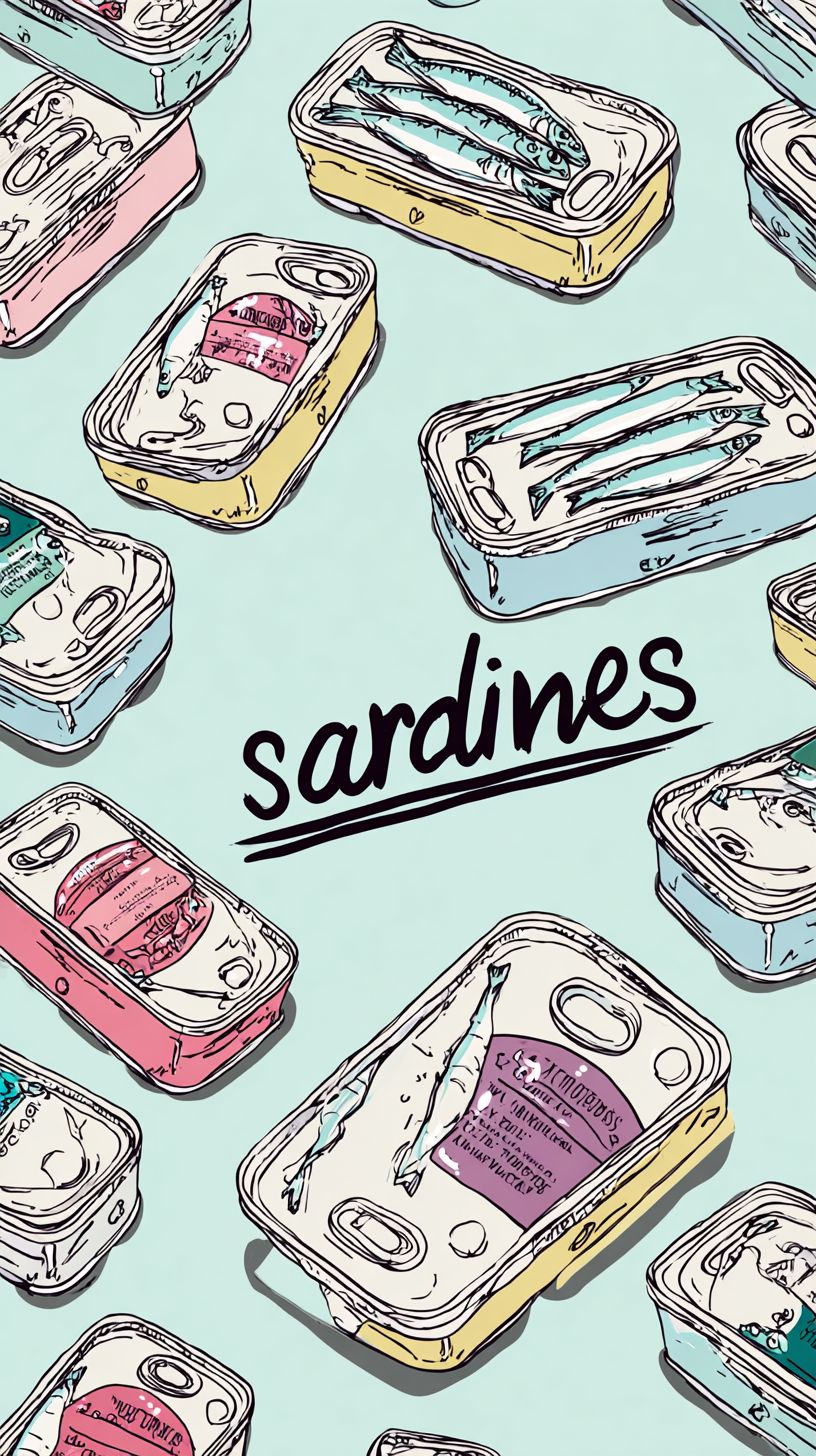 a simple line drawing of sardines in tins, the name "sardines" is written on one can, on a light mint background, in the style of gemma correll, with a quirky and whimsical character design and expressive lines. the colors are muted pastels, creating an illustrative feel --ar 9:16
