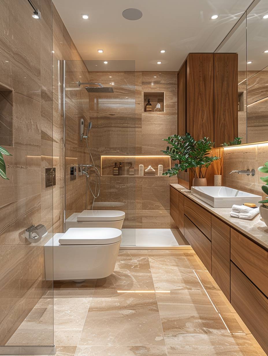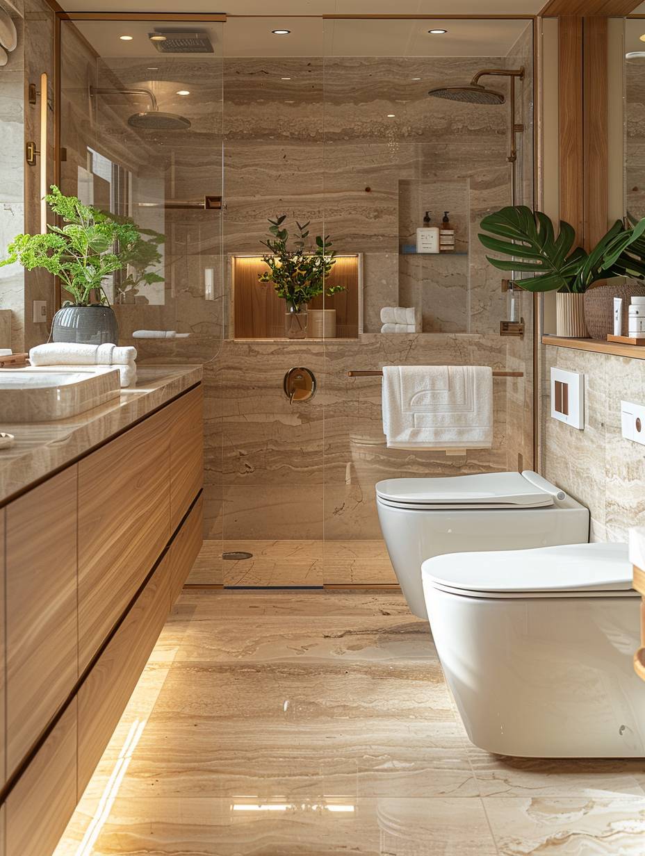 Salle de bain ultra-petite, style de design minimaliste italien, textures en pierre naturelle, séparation humide et sèche, toilettes intelligentes, meuble de salle de bain en bois massif, thème de couleur pierre crème.