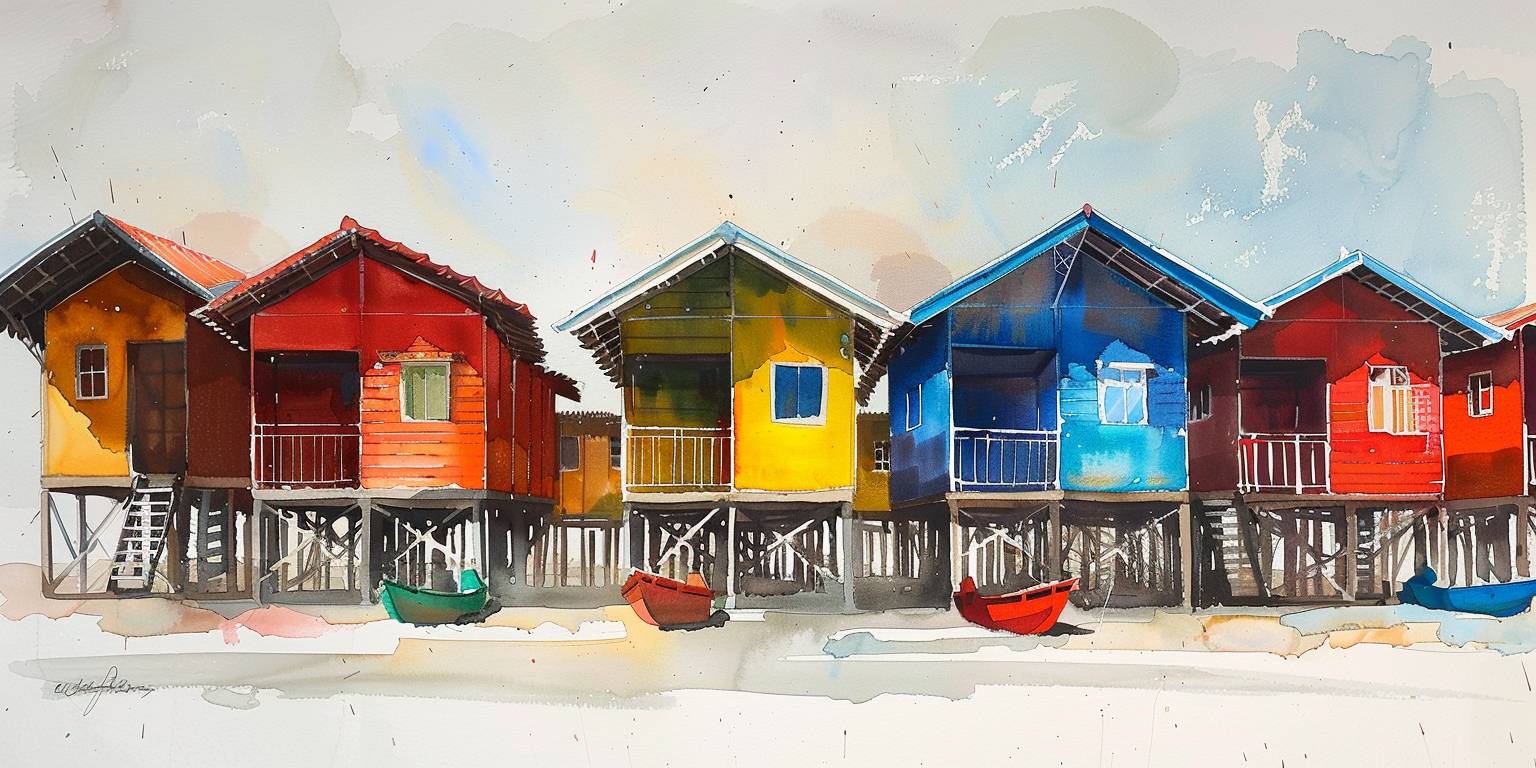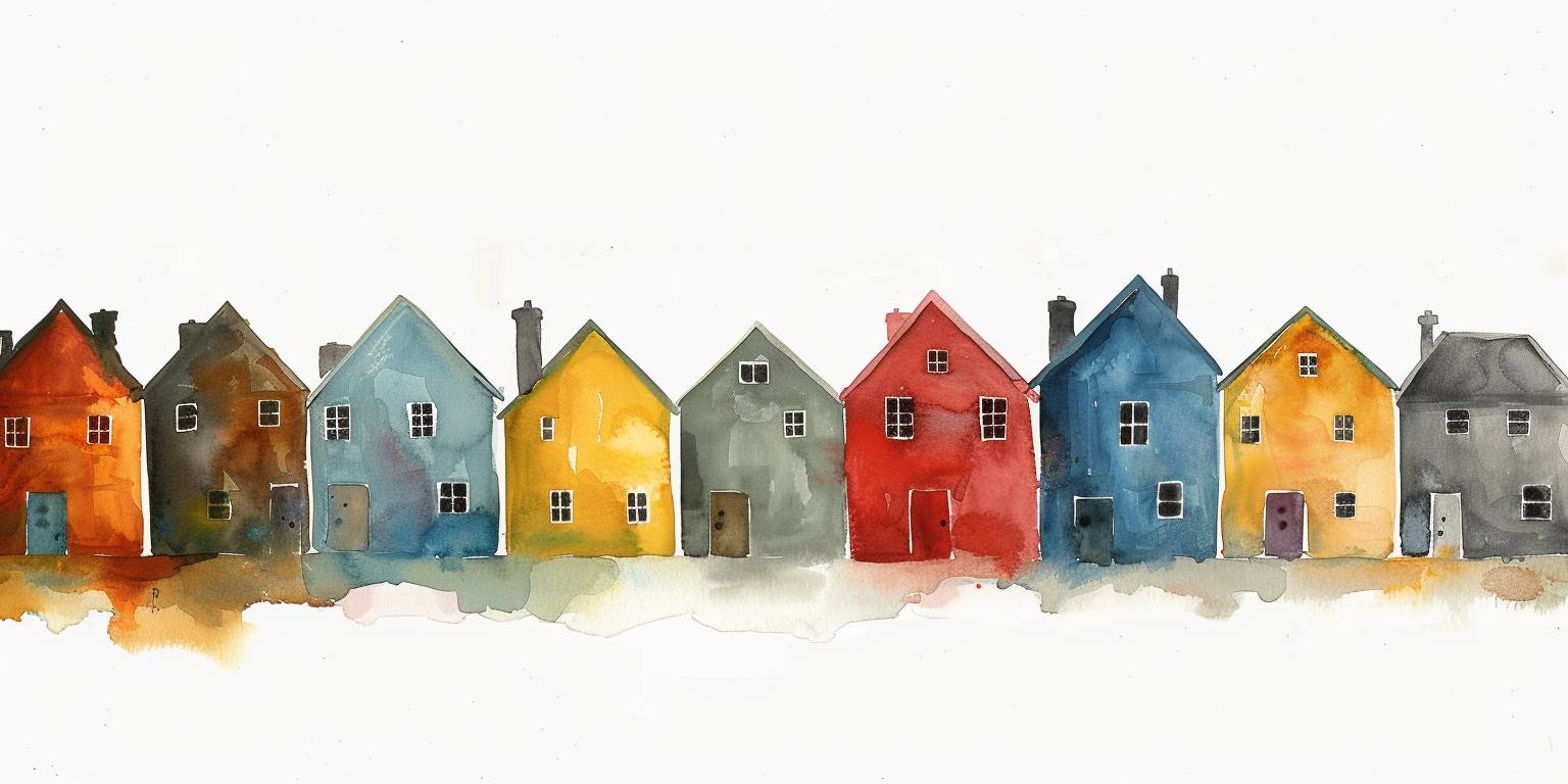Une rangée de maisons colorées, peinture à l'aquarelle, minimaliste, fond blanc.