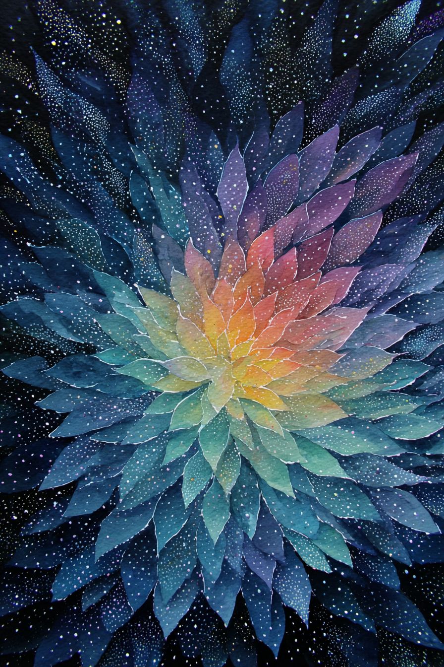 Des trous de ver, des nébuleuses, de magnifiques galaxies, d'innombrables étoiles, des paillettes étincelantes, des films texturés, ultra-détaillés, transcendant le temps et l'espace, extrêmement complexes, magnifiques, futuristes, hautement imaginatifs, riches en détails, de haute dimension et esthétiquement plaisants. Des peintures à l'aquarelle abstraite avec une base en lavis d'encre, présentant des couleurs vives, créent une atmosphère tranquille, mystérieuse et vibrante grâce à l'utilisation de la couleur, de la lumière, de l'ombre et du détail, permettant aux spectateurs de ressentir la conception artistique au sein de l'œuvre. Esthétiques oniriques, rendu, caractéristiques artistiques et un festin visuel.