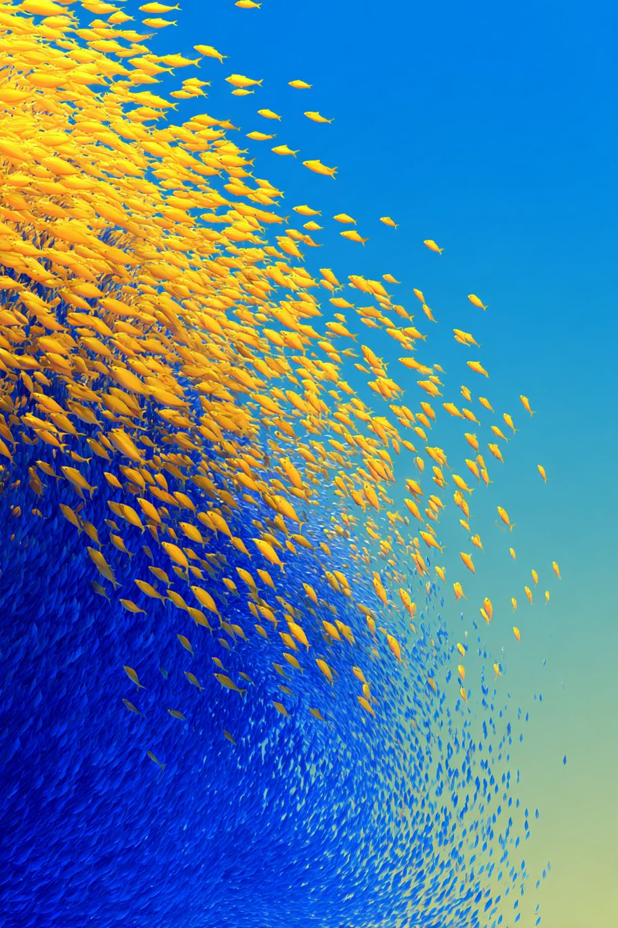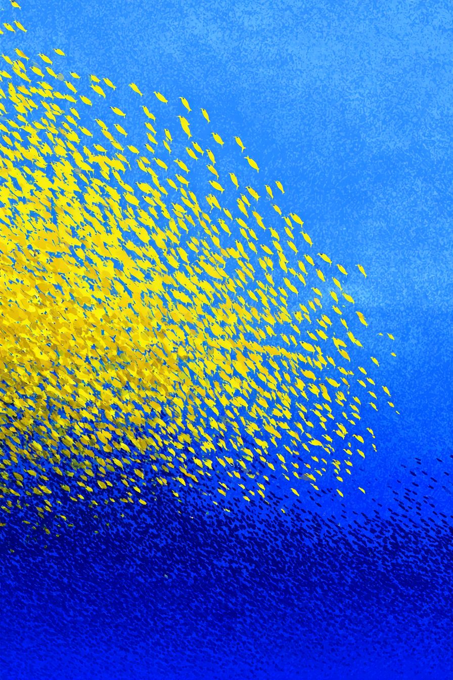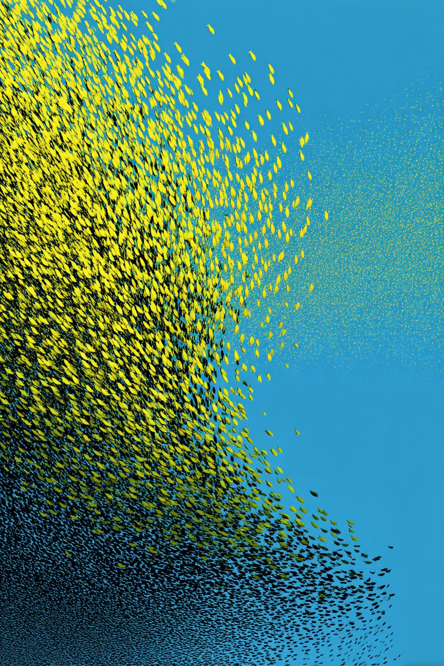 Artiste spirituel, illustration d'art abstrait, une école massive et dense de poissons jaunes fluorescents d'antimoine volant dans le ciel, présentant une texture de gradient fluide transparente, éthérée et rêveuse. En arrière-plan d'un ciel bleu Klein à gradient intense et à haute saturation. Avec un minimalisme extrême et une composition, cela crée une tension visuelle puissante pour une affiche, mettant en valeur une œuvre de design graphique magistrale.